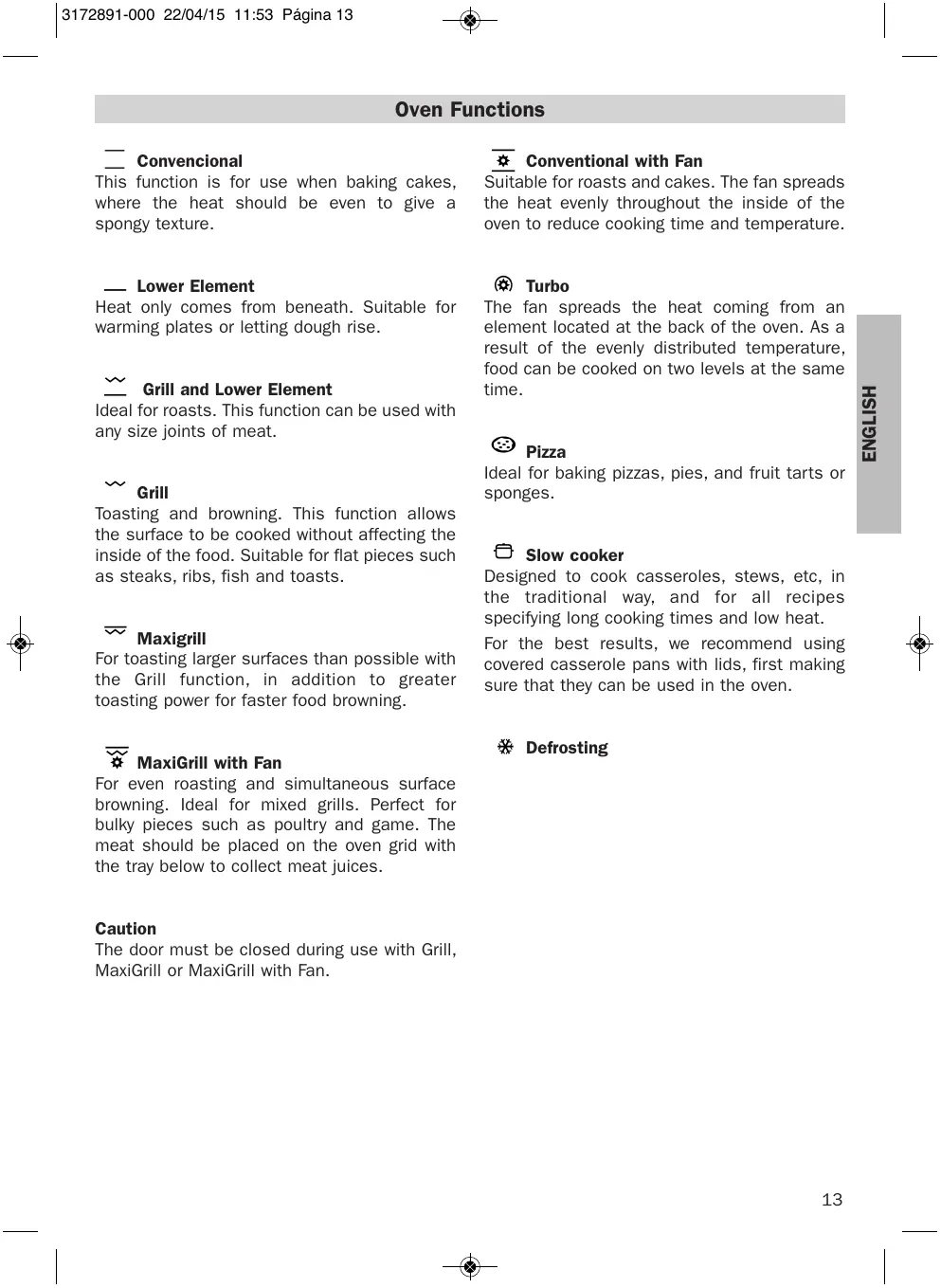 Suitable for roasts and cakes. The fan spreads the heat evenly throughout the inside of the oven to reduce cooking time and temperature.