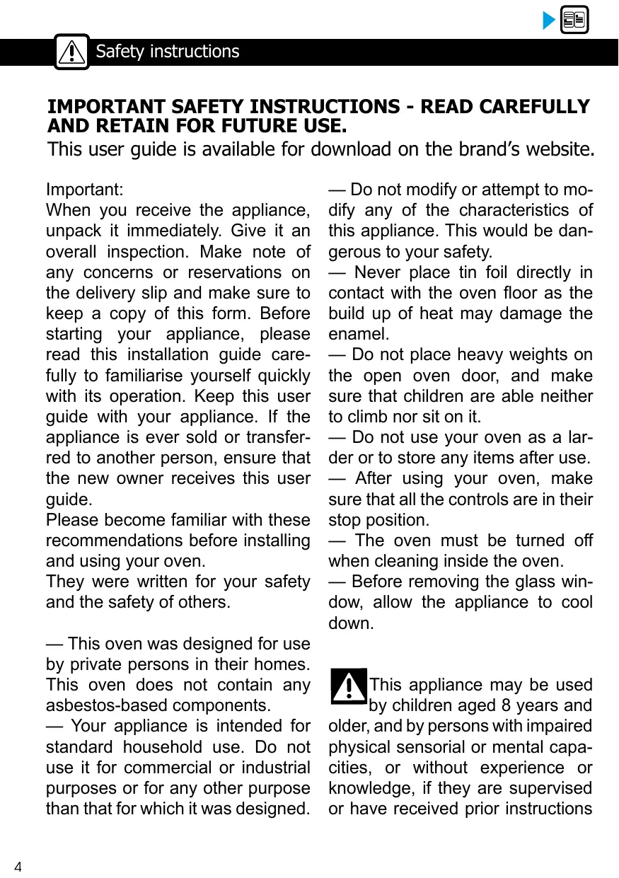 This user guide is available for download on the brand’s website. Important: When you receive the appliance, unpack it immediately. Give it an overall inspection. Make note of any concerns or reservations on the delivery slip and make sure to keep a copy of this form. Before starting your appliance, please read this installation guide carefully to familiarise yourself quickly with its operation. Keep this user guide with your appliance. If the appliance is ever sold or transferred to another person, ensure that the new owner receives this user guide. Please become familiar with these recommendations before installing and using your oven. They were written for your safety and the safety of others. — This oven was designed for use by private persons in their homes. This oven does not contain any asbestos-based components. — Your appliance is intended for standard household use. Do not use it for commercial or industrial purposes or for any other purpose than that for which it was designed. 4