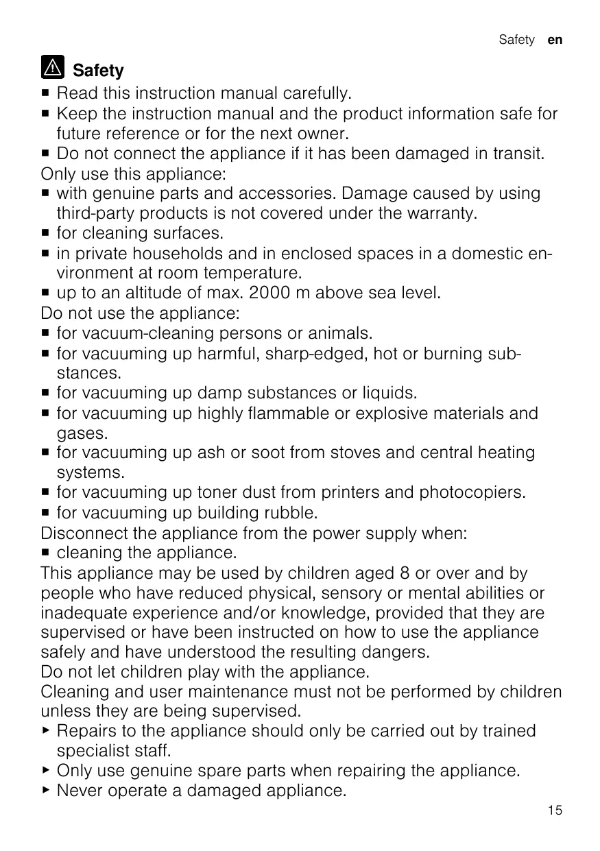 ¡ Read this instruction manual carefully. ¡ Keep the instruction manual and the product information safe for future reference or for the next owner. ¡ Do not connect the appliance if it has been damaged in transit. Only use this appliance: ¡ with genuine parts and accessories. Damage caused by using third-party products is not covered under the warranty. ¡ for cleaning surfaces. ¡ in private households and in enclosed spaces in a domestic environment at room temperature. ¡ up to an altitude of max. 2000 m above sea level. Do not use the appliance: ¡ for vacuum-cleaning persons or animals. ¡ for vacuuming up harmful, sharp-edged, hot or burning substances. ¡ for vacuuming up damp substances or liquids. ¡ for vacuuming up highly flammable or explosive materials and gases. ¡ for vacuuming up ash or soot from stoves and central heating systems. ¡ for vacuuming up toner dust from printers and photocopiers. ¡ for vacuuming up building rubble. Disconnect the appliance from the power supply when: ¡ cleaning the appliance. This appliance may be used by children aged 8 or over and by people who have reduced physical, sensory or mental abilities or inadequate experience and/or knowledge, provided that they are supervised or have been instructed on how to use the appliance safely and have understood the resulting dangers. Do not let children play with the appliance. Cleaning and user maintenance must not be performed by children unless they are being supervised. ▶ Repairs to the appliance should only be carried out by trained specialist staff. ▶ Only use genuine spare parts when repairing the appliance. ▶ Never operate a damaged appliance.