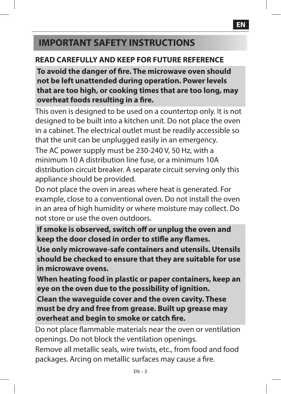 READ CAREFULLY AND KEEP FOR FUTURE REFERENCE To avoid the danger of fire. The microwave oven should not be left unattended during operation. Power levels that are too high, or cooking times that are too long, may overheat foods resulting in a fire. This oven is designed to be used on a countertop only. It is not designed to be built into a kitchen unit. Do not place the oven in a cabinet. The electrical outlet must be readily accessible so that the unit can be unplugged easily in an emergency. The AC power supply must be 230-240 V, 50 Hz, with a minimum 10 A distribution line fuse, or a minimum 10A distribution circuit breaker. A separate circuit serving only this appliance should be provided. Do not place the oven in areas where heat is generated. For example, close to a conventional oven. Do not install the oven in an area of high humidity or where moisture may collect. Do not store or use the oven outdoors. If smoke is observed, switch off or unplug the oven and keep the door closed in order to stifle any flames. Use only microwave-safe containers and utensils. Utensils should be checked to ensure that they are suitable for use in microwave ovens. When heating food in plastic or paper containers, keep an eye on the oven due to the possibility of ignition. Clean the waveguide cover and the oven cavity. These must be dry and free from grease. Built up grease may overheat and begin to smoke or catch fire. Do not place flammable materials near the oven or ventilation openings. Do not block the ventilation openings. Remove all metallic seals, wire twists, etc., from food and food packages. Arcing on metallic surfaces may cause a fire. EN – 3 Do not use the microwave oven to heat oil for deep frying. The temperature cannot be controlled and the oil may catch fire. To make popcorn, use only special microwave popcorn makers. Do not store food or any other items inside the oven. Check the settings after you start the oven to ensure the oven is operating as desired. Do not leave the oven unattended while it is operating. To avoid overheating and fire, special care must be taken when cooking or reheating foods with a high sugar or fat content, for example, Sausage rolls, Pies or Christmas pudding. See the corresponding hints in the user manual. To avoid the possibility of injury. WARNING: Do not operate the oven if it is damaged or malfunctioning. Check the following before use: a) Make sure the door closes properly and ensure it is not misaligned or warped. b) Check to make sure the hinges and safety door latches are not broken or loose. c) Ensure that the door seals and sealing surfaces have not been damaged. d) Make sure inside the oven cavity or on the door are no dents. e) Ensure that the power supply cord and plug are not damaged. If the door or door seals are damaged, the oven must not be operated until it has been repaired by a competent person. Never adjust, repair or modify the oven yourself. It is hazardous for anyone other than a competent person to carry out any service or repair operation which involves the removal of a cover which gives protection against exposure to microwave energy. Do not operate the oven with the door open or alter the door safety latches in any way. Do not operate the oven if there is an EN – 4