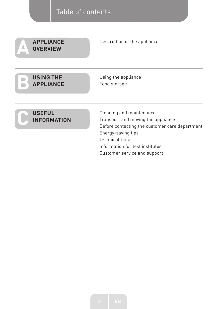 Useful information Technical data The above data can be found on the rating plate on the bottom of the appliance and on the packaging label. The QR code on the energy label supplied with the appliance contains a web link to information regarding the appliance’s performance, in the EU EPREL database. It is recommended to use the energy label for reference with the user manual and other documents supplied with the appliance. The same information can be found in the EPREL database at https://eprel.ece.europa.eu with the name of the model and product number found on the appliance’s rating plate. Information for test institutes The installation and preparation of the appliance to meet eco-design requirements should comply with the EN 62552 standard. The ventilation requirements, the dimensions of recesses and the minimum rear clearance must correspond to the indications in section 2 of this user manual. Please contact the manufacturer for more information, especially regarding loading plans. Customer service and support Always use original spare parts. When you contact our authorised service centre, make sure you have the following information available: Mode, serial number and service index. This information can be found on the rating plate. Subject to modification without notice. Original spare parts for some specific components are available 10 years starting from the availability date of the last unit of the model.