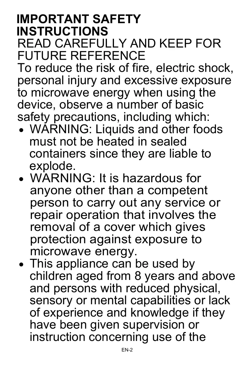 • WARNING: Liquids and other foods must not be heated in sealed containers since they are liable to explode. • WARNING: It is hazardous for anyone other than a competent person to carry out any service or repair operation that involves the removal of a cover which gives protection against exposure to microwave energy. • This appliance can be used by children aged from 8 years and above and persons with reduced physical, sensory or mental capabilities or lack of experience and knowledge if they have been given supervision or instruction concerning use of the EN-2