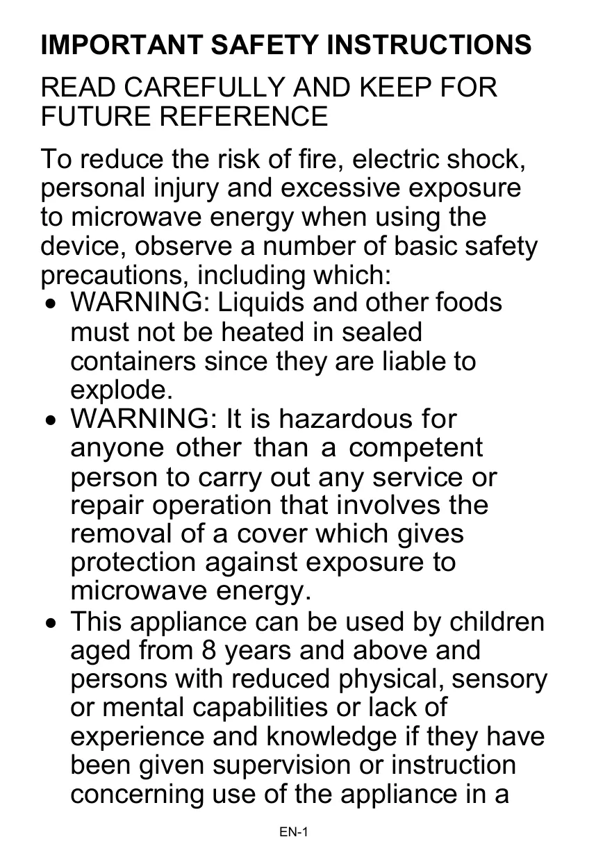 IMPORTANT SAFETY INSTRUCTIONS READ CAREFULLY AND KEEP FOR FUTURE REFERENCE To reduce the risk of fire, electric shock, personal injury and excessive exposure to microwave energy when using the device, observe a number of basic safety precautions, including which: • WARNING: Liquids and other foods must not be heated in sealed containers since they are liable to explode. • WARNING: It is hazardous for anyone other than a competent person to carry out any service or repair operation that involves the removal of a cover which gives protection against exposure to microwave energy. • This appliance can be used by children aged from 8 years and above and persons with reduced physical, sensory or mental capabilities or lack of experience and knowledge if they have been given supervision or instruction concerning use of the appliance in a EN-1
