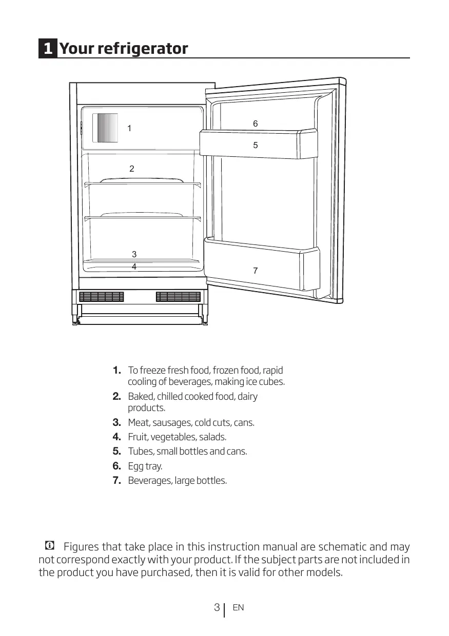 • Electrical safety of your refrigerator shall be guaranteed only if the earth system in your house complies with standards. • Exposing the product to rain, snow, sun and wind is dangerous with respect to electrical safety. • Contact authorized service when there is a power cable damage to avoid danger. • Never plug the refrigerator into the wall outlet during installation. Otherwise, risk of death or serious injury may arise. • This refrigerator is intended for only storing food items. It must not be used for any other purpose. • Label of technical specifications is located on the left wall inside the refrigerator. • Never connect your refrigerator to electricitysaving systems; they may damage the refrigerator. • If there is a blue light on the refrigerator, do not look at the blue light with optical tools. • For manually controlled refrigerators, wait for at least 5 minutes to start the refrigerator after power failure. • This operation manual should be handed in to the new owner of the product when it is given to others. 6