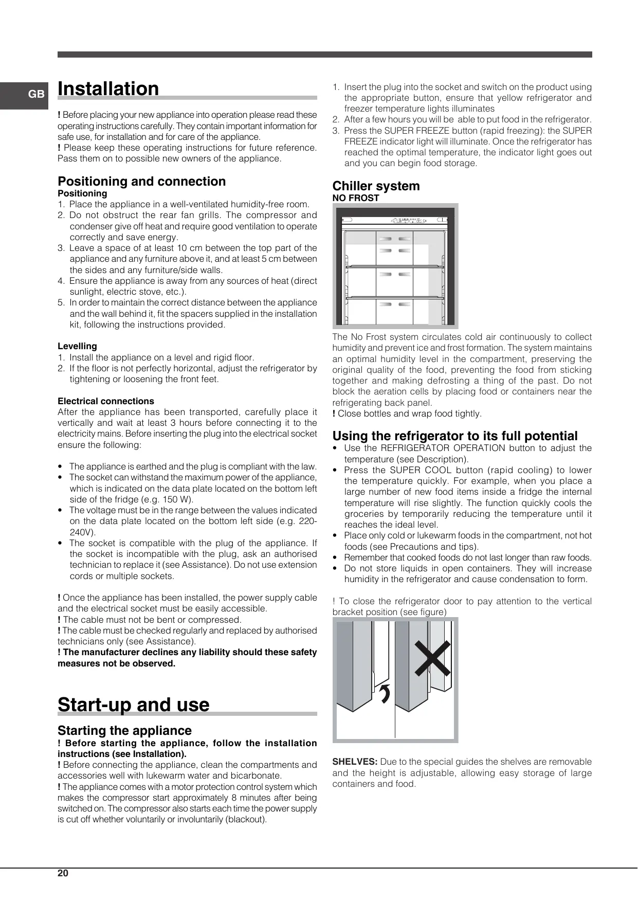 ! Before connecting the appliance, clean the compartments and accessories well with lukewarm water and bicarbonate. ! The appliance comes with a motor protection control system which makes the compressor start approximately 8 minutes after being switched on. The compressor also starts each time the power supply is cut off whether voluntarily or involuntarily (blackout).