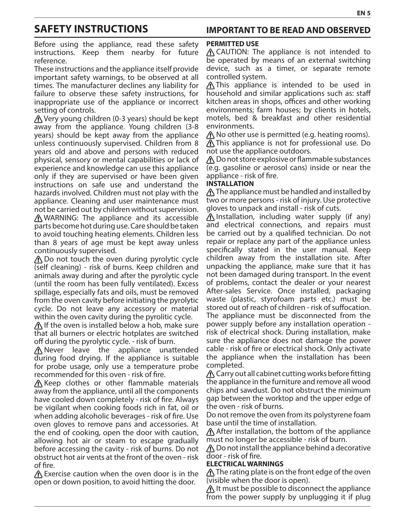 Le présent manuel et l'appareil en question contiennent des consignes de sécurité importantes qui doivent être lues et observées en tout temps. Le Fabricant décline toute responsabilité si les consignes de sécurité ne sont pas respectées, en cas de mauvaise utilisation de l’appareil, ou d'un mauvais réglage des commandes. Les enfants en bas âge (0-3 ans) doivent être tenus à l'écart de l'appareil. Les jeunes enfants (3-8 ans) doivent être tenus à l'écart de l'appareil sauf s'ils se trouvent sous surveillance constante. Les enfants âgés de 8 ans et plus, ainsi que les personnes présentant des capacités physiques, sensorielles ou mentales réduites, ou ne possédant ni l'expérience ni les connaissances requises, peuvent utiliser cet appareil seulement s'ils sont supervisés, ou si une personne responsable leur a expliqué l'utilisation sécuritaire et les dangers potentiels de l'appareil. Ne laissez pas les enfants jouer avec l'appareil. Les enfants ne doivent pas nettoyer, ni procéder à l'entretien de l'appareil sans surveillance. AVERTISSEMENT : L'appareil, ainsi que ses parties accessibles, peuvent atteindre température élevée lors de l'utilisation. Évitez tout contact avec les résistances. Les enfants de moins de 8 ans doivent être tenus à l'écart de l'appareil, à moins d'être sous surveillance constante. Ne touchez pas au four durant le cycle par pyrolyse (auto-nettoyant), vous pourriez vous brûler. Éloignez les enfants et les animaux du four pendant et après le cycle de nettoyage par pyrolyse (jusqu'à ce que la pièce soit bien aérée). Les débordements importants dans la cavité, comme les débordements d'huile et de gras, doivent être nettoyés avant de lancer le cycle de nettoyage. Ne laissez pas d'ustensiles ou de matériaux à l'intérieur de la cavité du four pendant le cycle à pyrolyse. Si le four est installé sous une table de cuisson, assurez-vous que les brûleurs ou les plaques électriques sont éteints pendant le cycle par pyrolyse. - vous pourriez vous brûler. Ne laissez jamais l'appareil sans surveillance pendant le séchage des aliments. Si une sonde peut être utilisée avec l’appareil, utilisez uniquement la sonde de température recommandée pour ce four - un incendie pourrait se déclarer. Gardez les vêtements et autres matières inflammables loin de l’appareil jusqu’à ce que toutes les composantes soient complètement refroidies - un incendie pourrait se déclarer. Soyez