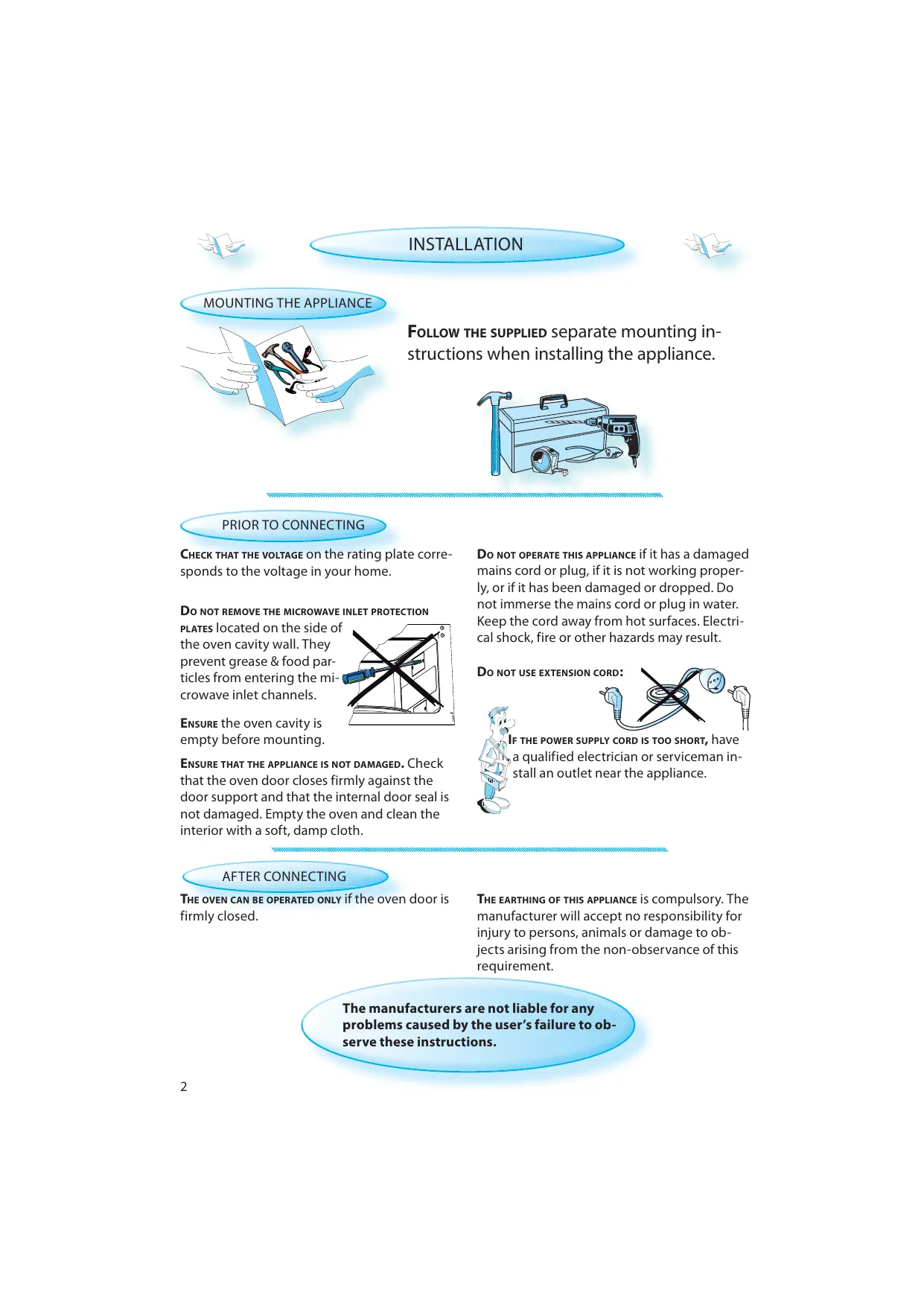 THE EARTHING OF THIS APPLIANCE is compulsory. The manufacturer will accept no responsibility for injury to persons, animals or damage to ob- jects arising from the non-observance of this requirement.