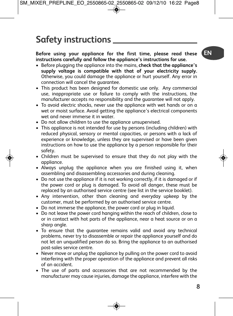 Before using your appliance for the first time, please read these instructions carefully and follow the appliance’s instructions for use. • Before plugging the appliance into the mains, check that the appliance’s supply voltage is compatible with that of your electricity supply. Otherwise, you could damage the appliance or hurt yourself. Any error in connection will cancel the guarantee. • This product has been designed for domestic use only. Any commercial use, inappropriate use or failure to comply with the instructions, the manufacturer accepts no responsibility and the guarantee will not apply. • To avoid electric shocks, never use the appliance with wet hands or on a wet or moist surface. Avoid getting the appliance’s electrical components wet and never immerse it in water. • Do not allow children to use the appliance unsupervised. • This appliance is not intended for use by persons (including children) with reduced physical, sensory or mental capacities, or persons with a lack of experience or knowledge, unless they are supervised or have been given instructions on how to use the appliance by a person responsible for their safety. • Children must be supervised to ensure that they do not play with the appliance. • Always unplug the appliance when you are finished using it, when assembling and disassembling accessories and during cleaning. • Do not use the appliance if it is not working correctly, if it is damaged or if the power cord or plug is damaged. To avoid all danger, these must be replaced by an authorised service centre (see list in the service booklet). • Any intervention, other than cleaning and everyday upkeep by the customer, must be performed by an authorised service centre. • Do not immerse the appliance, the power cord or plug in liquid. • Do not leave the power cord hanging within the reach of children, close to or in contact with hot parts of the appliance, near a heat source or on a sharp angle. • To ensure that the guarantee remains valid and avoid any technical problems, never try to disassemble or repair the appliance yourself and do not let an unqualified person do so. Bring the appliance to an authorised post-sales service centre. • Never move or unplug the appliance by pulling on the power cord to avoid interfering with the proper operation of the appliance and prevent all risks of an accident. • The use of parts and accessories that are not recommended by the manufacturer may cause injuries, damage the appliance, interfere with the