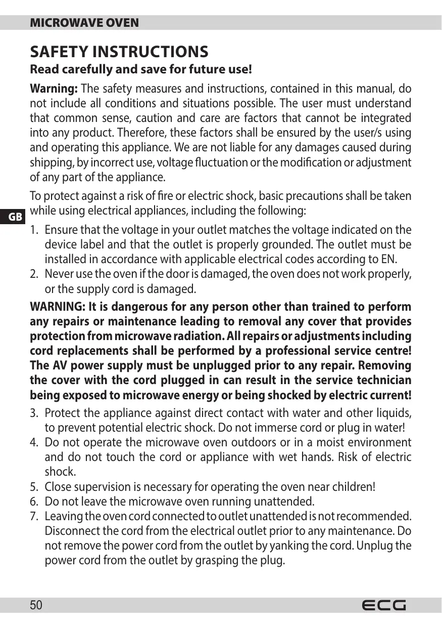 19.Use the microwave oven only in accordance with the instructions given in this manual. This microwave oven is intended for domestic use only. The manufacturer is not liable for damages caused by the improper use of this appliance.