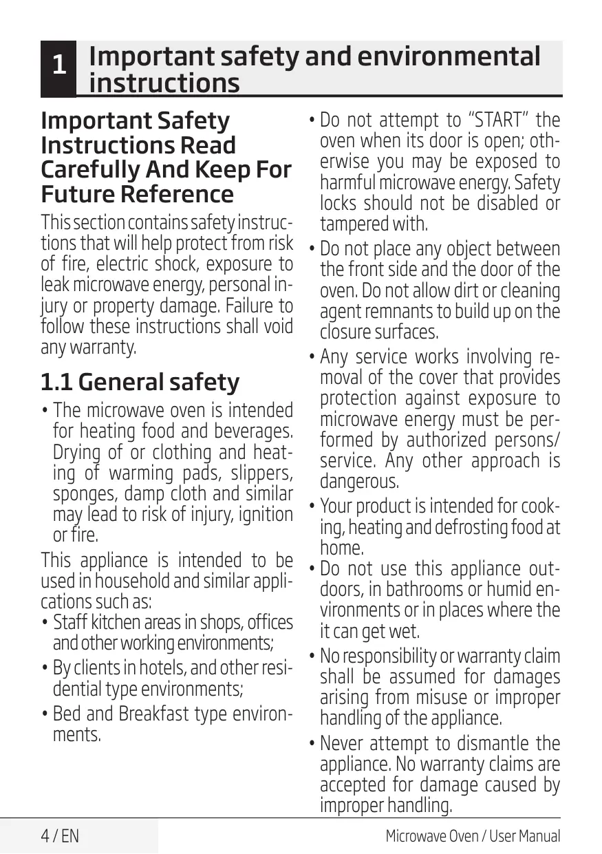 - Never attempt to dismantle the appliance. No warranty claims are accepted for damage caused by improper handling. 4 / EN Microwave Oven / User Manual 1 I mportant safety and environmental instructions
