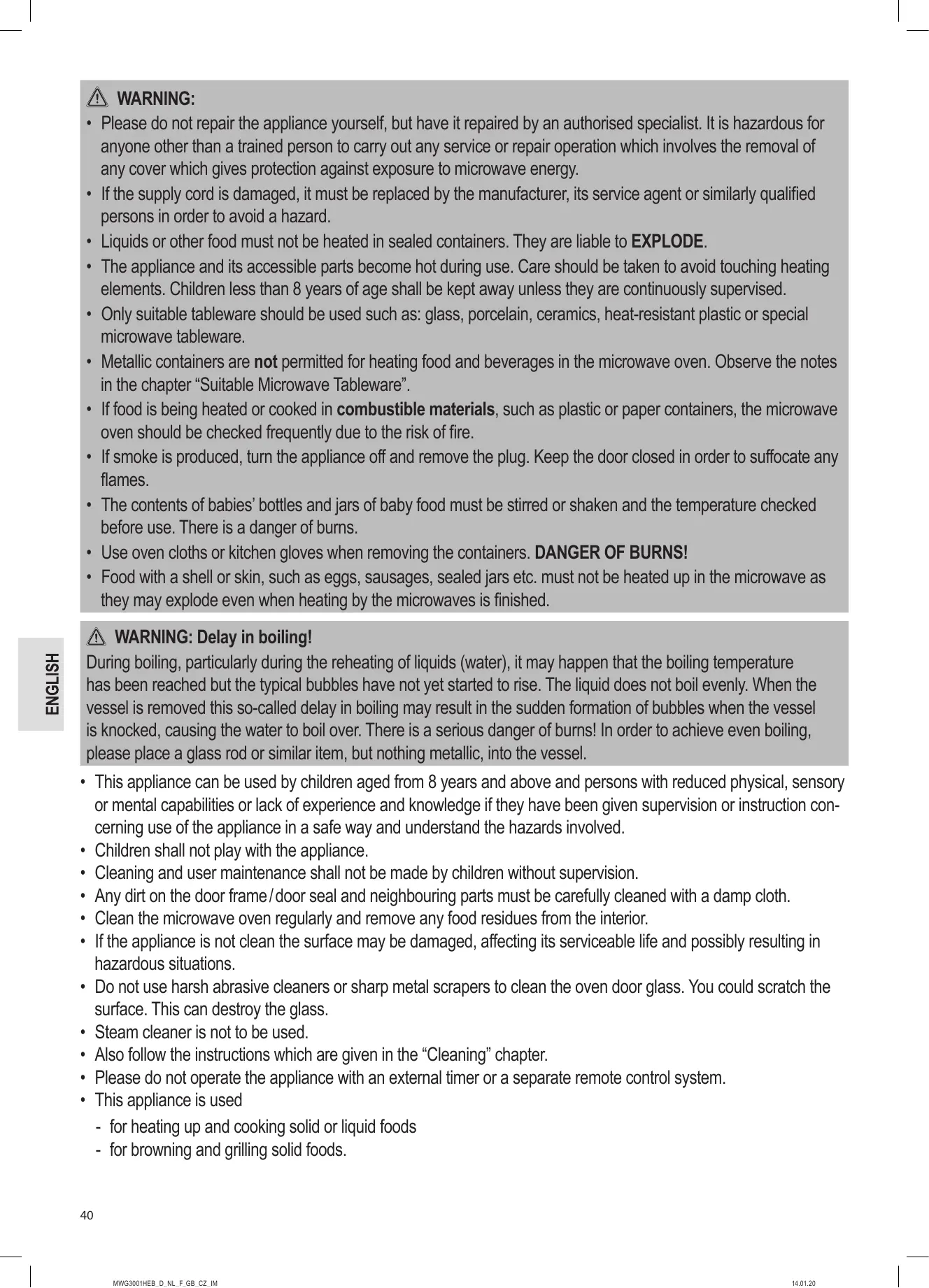 Please do not repair the appliance yourself, but have it repaired by an authorised specialist. It is hazardous for anyone other than a trained person to carry out any service or repair operation which involves the removal of any cover which gives protection against exposure to microwave energy. If the supply cord is damaged, it must be replaced by the manufacturer, its service agent or similarly qualified persons in order to avoid a hazard. Liquids or other food must not be heated in sealed containers. They are liable to EXPLODE. The appliance and its accessible parts become hot during use. Care should be taken to avoid touching heating elements. Children less than 8 years of age shall be kept away unless they are continuously supervised. Only suitable tableware should be used such as: glass, porcelain, ceramics, heat-resistant plastic or special microwave tableware. Metallic containers are not permitted for heating food and beverages in the microwave oven. Observe the notes in the chapter “Suitable Microwave Tableware”. If food is being heated or cooked in combustible materials, such as plastic or paper containers, the microwave oven should be checked frequently due to the risk of fire. If smoke is produced, turn the appliance off and remove the plug. Keep the door closed in order to suffocate any flames. The contents of babies’ bottles and jars of baby food must be stirred or shaken and the temperature checked before use. There is a danger of burns. Use oven cloths or kitchen gloves when removing the containers. DANGER OF BURNS! Food with a shell or skin, such as eggs, sausages, sealed jars etc. must not be heated up in the microwave as they may explode even when heating by the microwaves is finished.