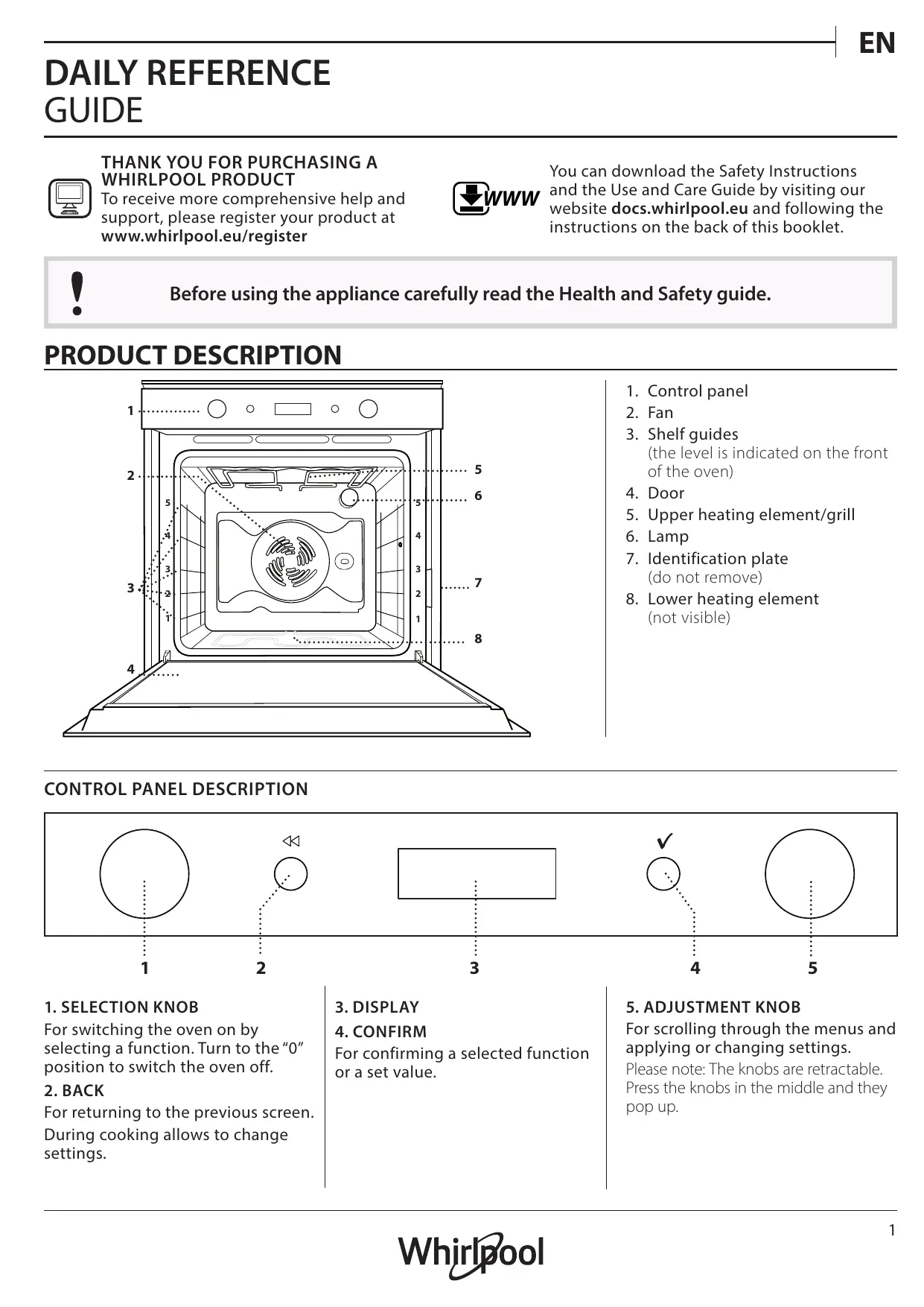DAILY REFERENCE GUIDE THANK YOU FOR PURCHASING A WHIRLPOOL PRODUCT WWW To receive more comprehensive help and support, please register your product at www.whirlpool.eu/register