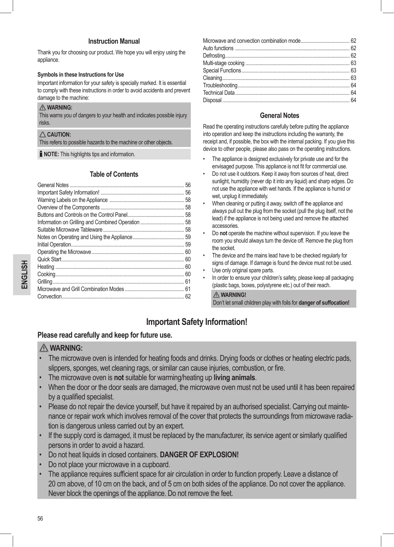 Place the appliance with the back facing a wall. The appliance and its accessible parts become hot during use. Care should be taken to avoid touching heating elements. Children less than 8 years of age shall be kept away unless they are continuously supervised. Only suitable tableware should be used such as: glass, porcelain, ceramics, heat-resistant plastic or special microwave tableware. If food is being heated or cooked in combustible materials, such as plastic or paper containers, the microwave oven should be checked frequently due to the risk of fire. If smoke is produced, turn the device off and remove the plug. Keep the door closed in order to suffocate any flames. The contents of babies’ bottles and jars of baby food must be stirred or shaken and the temperature checked before use. There is a danger of burns. Use oven cloths or kitchen gloves when removing the containers. DANGER OF BURNS! Food with a shell or skin, such as eggs, sausages, sealed jars etc. must not be heated up in the microwave as they may explode even when heating by the microwaves is finished. WARNING Delay in boiling: During boiling, particularly during the reheating of liquids (water), it may happen that the boiling temperature has been reached but the typical bubbles have not yet started to rise. The liquid does not boil evenly. When the vessel is removed this so-called delay in boiling may result in the sudden formation of bubbles when the vessel is knocked, causing the water to boil over. There is a serious danger of burns! In order to achieve even boiling, please place a glass rod or similar item, but nothing metallic, in the vessel.