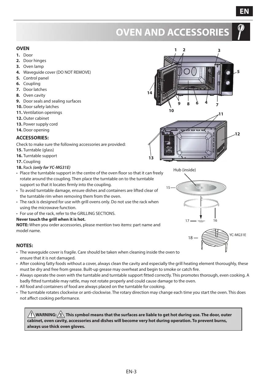 YC-MG31E NOTES: • The waveguide cover is fragile. Care should be taken when cleaning inside the oven to ensure that it is not damaged. • After cooking fatty foods without a cover, always clean the cavity and especially the grill heating element thoroughly, these must be dry and free from grease. Built-up grease may overheat and begin to smoke or catch fire. • Always operate the oven with the turntable and turntable support fitted correctly. This promotes thorough, even cooking. A badly fitted turntable may rattle, may not rotate properly and could cause damage to the oven. • All food and containers of food are always placed on the turntable for cooking. • The turntable rotates clockwise or anti-clockwise. The rotary direction may change each time you start the oven. This does not affect cooking performance. WARNING: This symbol means that the surfaces are liable to get hot during use. The door, outer cabinet, oven cavity, accessories and dishes will become very hot during operation. To prevent burns, always use thick oven gloves.