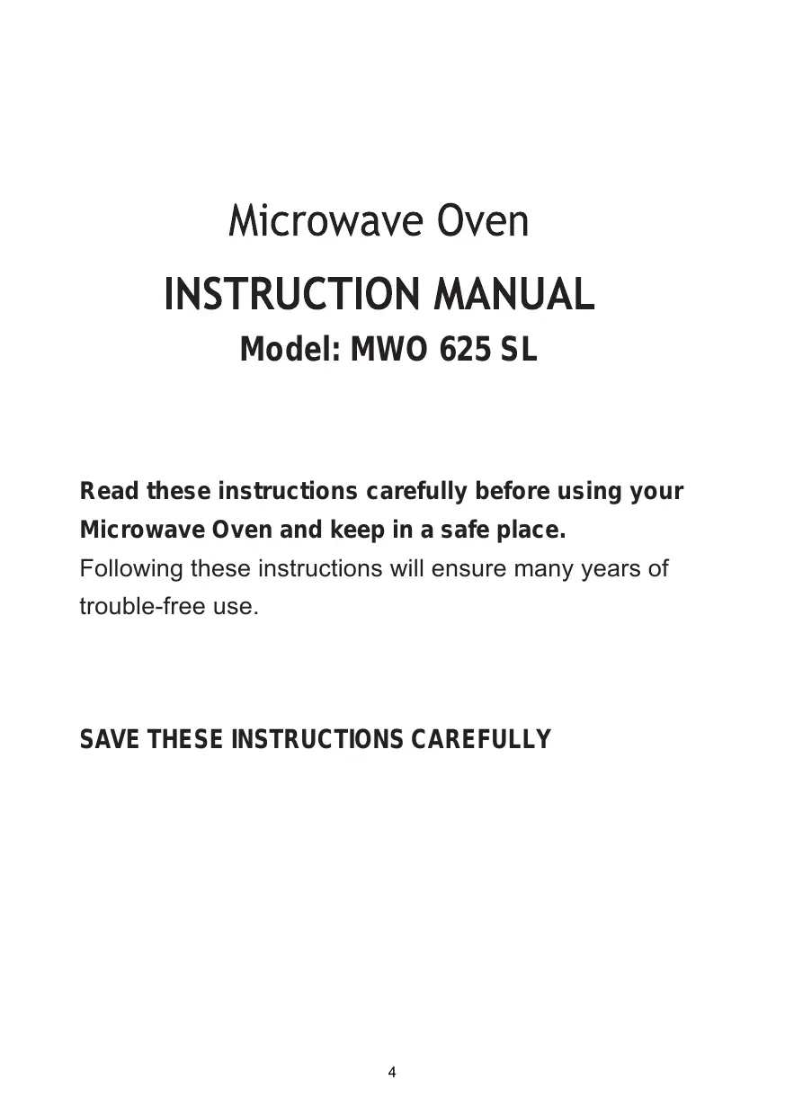 Model: MWO 625 SL Read these instructions carefully before using your Microwave Oven and keep in a safe place. Following these instructions will ensure many years of trouble-free use.
