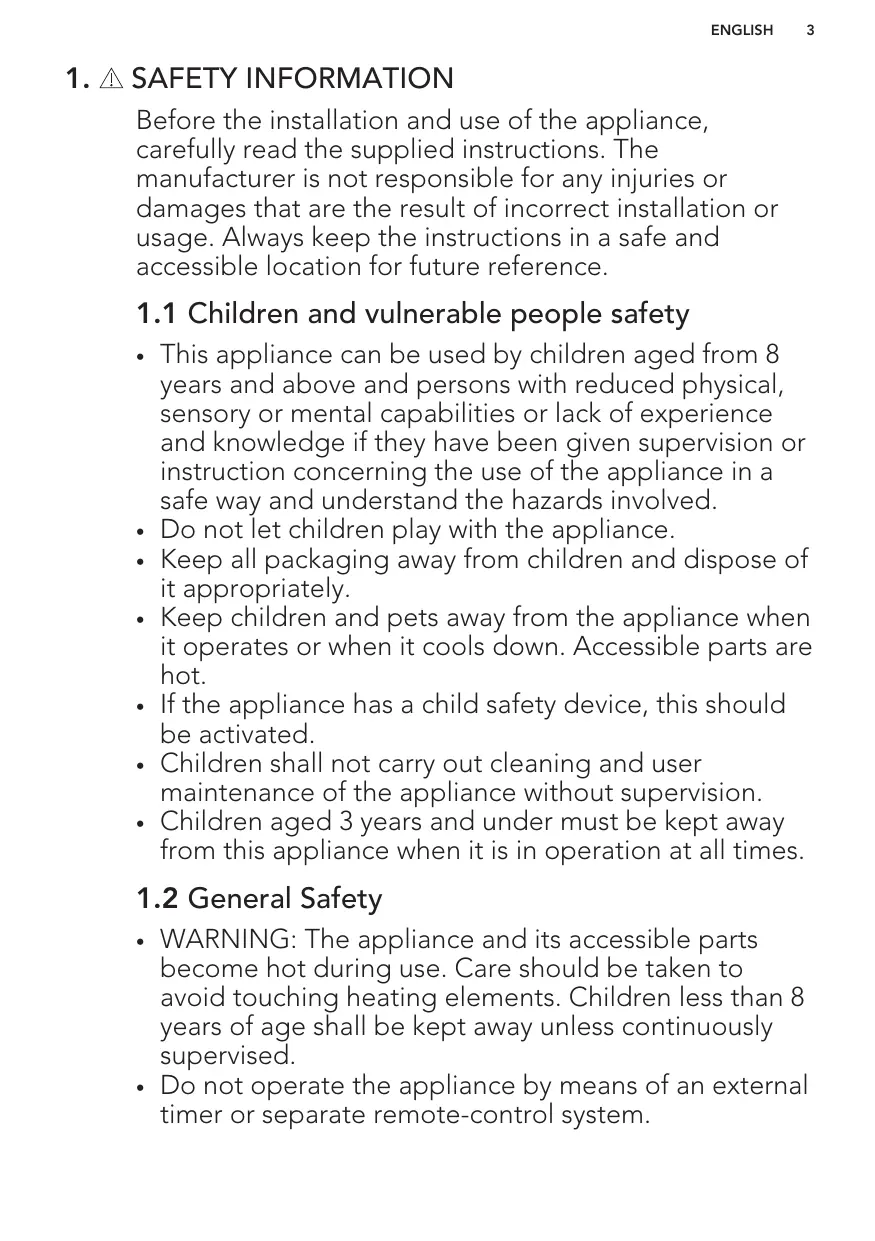 This appliance can be used by children aged from 8 years and above and persons with reduced physical, sensory or mental capabilities or lack of experience and knowledge if they have been given supervision or instruction concerning the use of the appliance in a safe way and understand the hazards involved. Do not let children play with the appliance. Keep all packaging away from children and dispose of it appropriately. Keep children and pets away from the appliance when it operates or when it cools down. Accessible parts are hot. If the appliance has a child safety device, this should be activated. Children shall not carry out cleaning and user maintenance of the appliance without supervision. Children aged 3 years and under must be kept away from this appliance when it is in operation at all times.