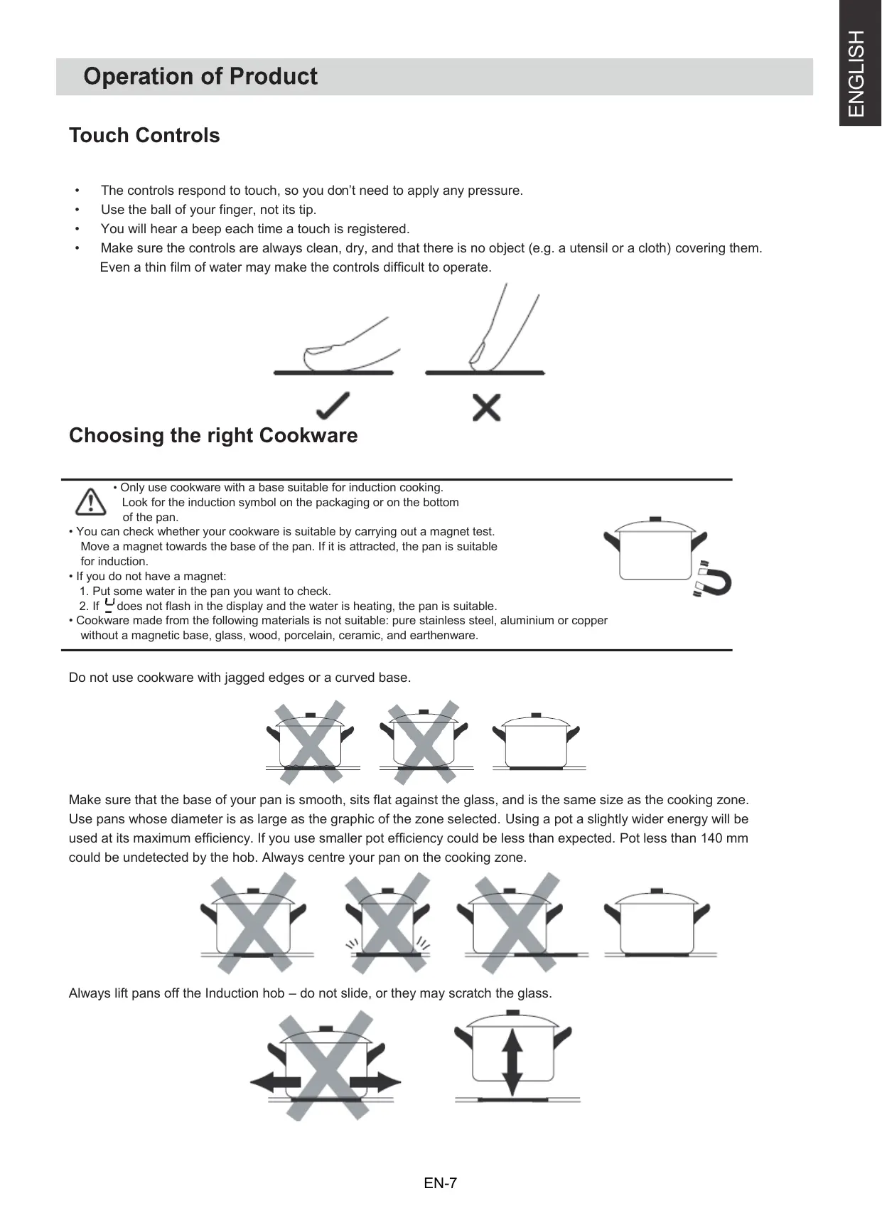 • You can check whether your cookware is suitable by carrying out a magnet test. Move a magnet towards the base of the pan. If it is attracted, the pan is suitable for induction. • If you do not have a magnet: 1. Put some water in the pan you want to check. 2. If does not flash in the display and the water is heating, the pan is suitable. • Cookware made from the following materials is not suitable: pure stainless steel, aluminium or copper without a magnetic base, glass, wood, porcelain, ceramic, and earthenware.