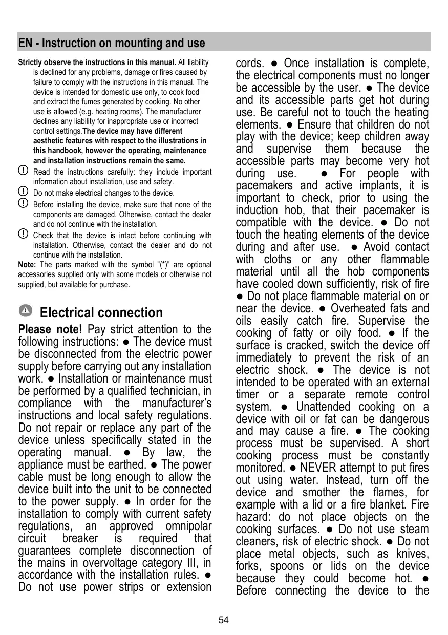 PLEASE NOTE: The accessible parts of the device may become hot when the hob is switched on. ● Please note! Do not connect the device to the electric power supply until installation has been fully completed. The regulations laid down by local authorities must be strictly followed with regard to the technical and safety measures to adopt for fume extraction. ● The extracted air must not be conveyed through the same ducts used to extract the fumes generated by gas combustion or other types of combustion devices. Never use the device without the grille properly installed! Only use the fastening screws supplied with the device for installation, or if not supplied, purchase the correct type of screws. Use screws of the right length, as indicated in the installation guide. ● When the device is used together with other devices powered with 55