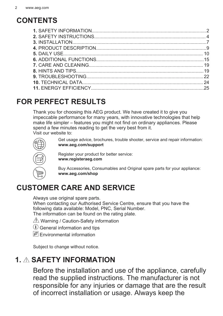 Get usage advice, brochures, trouble shooter, service and repair information: www.aeg.com/support