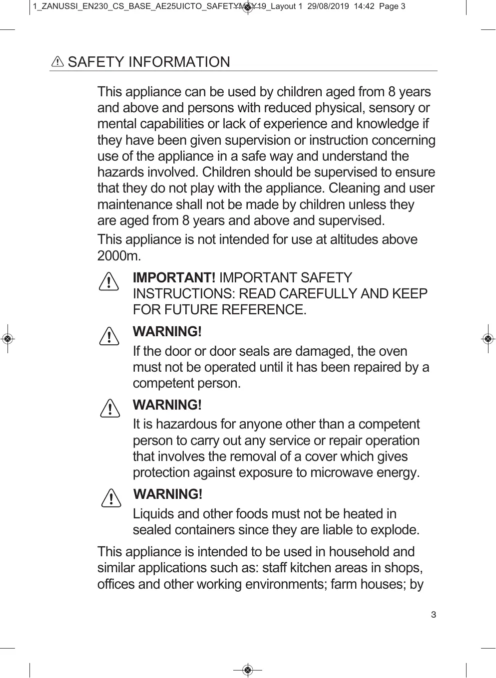 FOR FUTURE REFERENCE. WARNING! If the door or door seals are damaged, the oven must not be operated until it has been repaired by a competent person. WARNING! It is hazardous for anyone other than a competent person to carry out any service or repair operation that involves the removal of a cover which gives protection against exposure to microwave energy. WARNING! Liquids and other foods must not be heated in sealed containers since they are liable to explode. This appliance is intended to be used in household and similar applications such as: staff kitchen areas in shops, offices and other working environments; farm houses; by