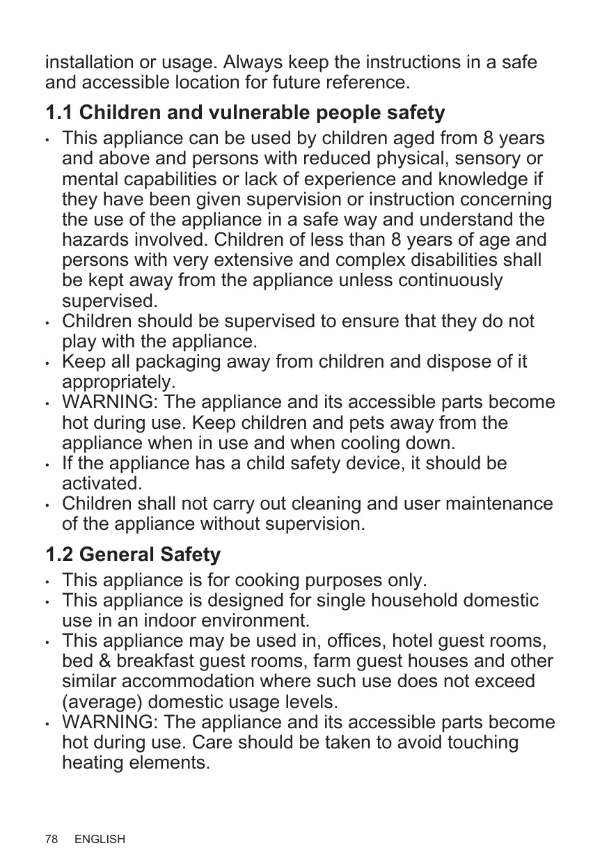 Children should be supervised to ensure that they do not play with the appliance. Keep all packaging away from children and dispose of it appropriately. WARNING: The appliance and its accessible parts become hot during use. Keep children and pets away from the appliance when in use and when cooling down. If the appliance has a child safety device, it should be activated. Children shall not carry out cleaning and user maintenance of the appliance without supervision.