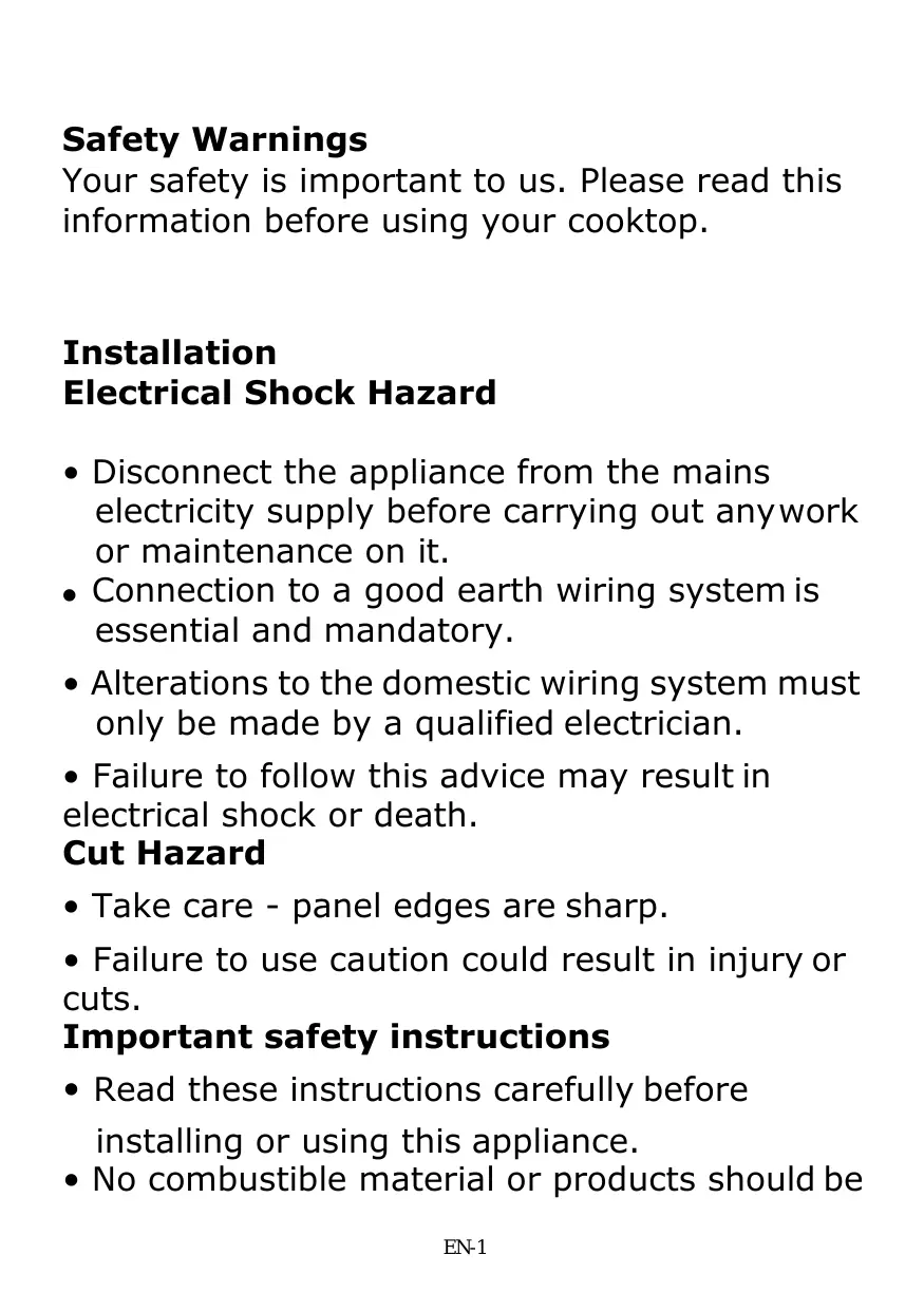 Thank you for purchasing the Candy induction hob. Please read this instruction manual carefully before using the hob and keep it in a safe place for future reference. Safety Warnings Your safety is important to us. Please read this information before using your cooktop. Installation Electrical Shock Hazard