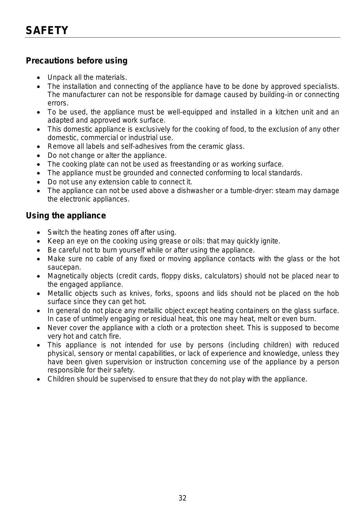 Switch the heating zones off after using. Keep an eye on the cooking using grease or oils: that may quickly ignite. Be careful not to burn yourself while or after using the appliance. Make sure no cable of any fixed or moving appliance contacts with the glass or the hot saucepan. Magnetically objects (credit cards, floppy disks, calculators) should not be placed near to the engaged appliance. Metallic objects such as knives, forks, spoons and lids should not be placed on the hob surface since they can get hot. In general do not place any metallic object except heating containers on the glass surface. In case of untimely engaging or residual heat, this one may heat, melt or even burn. Never cover the appliance with a cloth or a protection sheet. This is supposed to become very hot and catch fire. This appliance is not intended for use by persons (including children) with reduced physical, sensory or mental capabilities, or lack of experience and knowledge, unless they have been given supervision or instruction concerning use of the appliance by a person responsible for their safety. Children should be supervised to ensure that they do not play with the appliance.