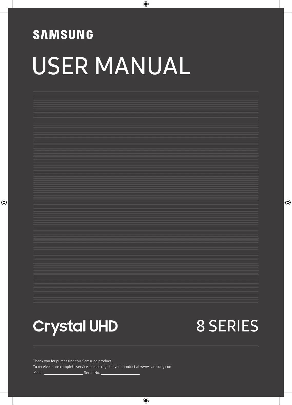 8 SERIES Thank you for purchasing this Samsung product. To receive more complete service, please register your product at www.samsung.com Model Serial No. Before Reading This User Manual This TV comes with this user manual and an embedded e-Manual. Before reading this user manual, review the following: User Manual Read this provided user manual to see information about product safety, installation, accessories, initial configuration, and product specifications. e-Manual For more information about this TV, read the e-Manual embedded in the product.
