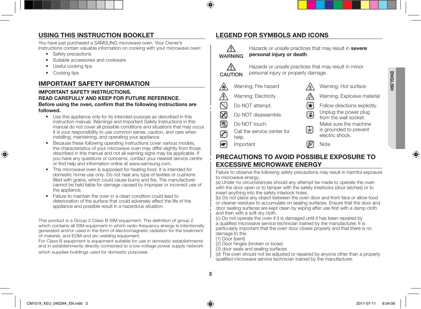 CM1519_XEU_04029A_EN.indd 2 2011-07-11 6:54:05 Using this instruction booklet Legend for symbols and icons Important safety information IMPORTANT SAFETY INSTRUCTIONS. READ CAREFULLY AND KEEP FOR FUTURE REFERENCE. Before using the oven, confirm that the following instructions are followed.