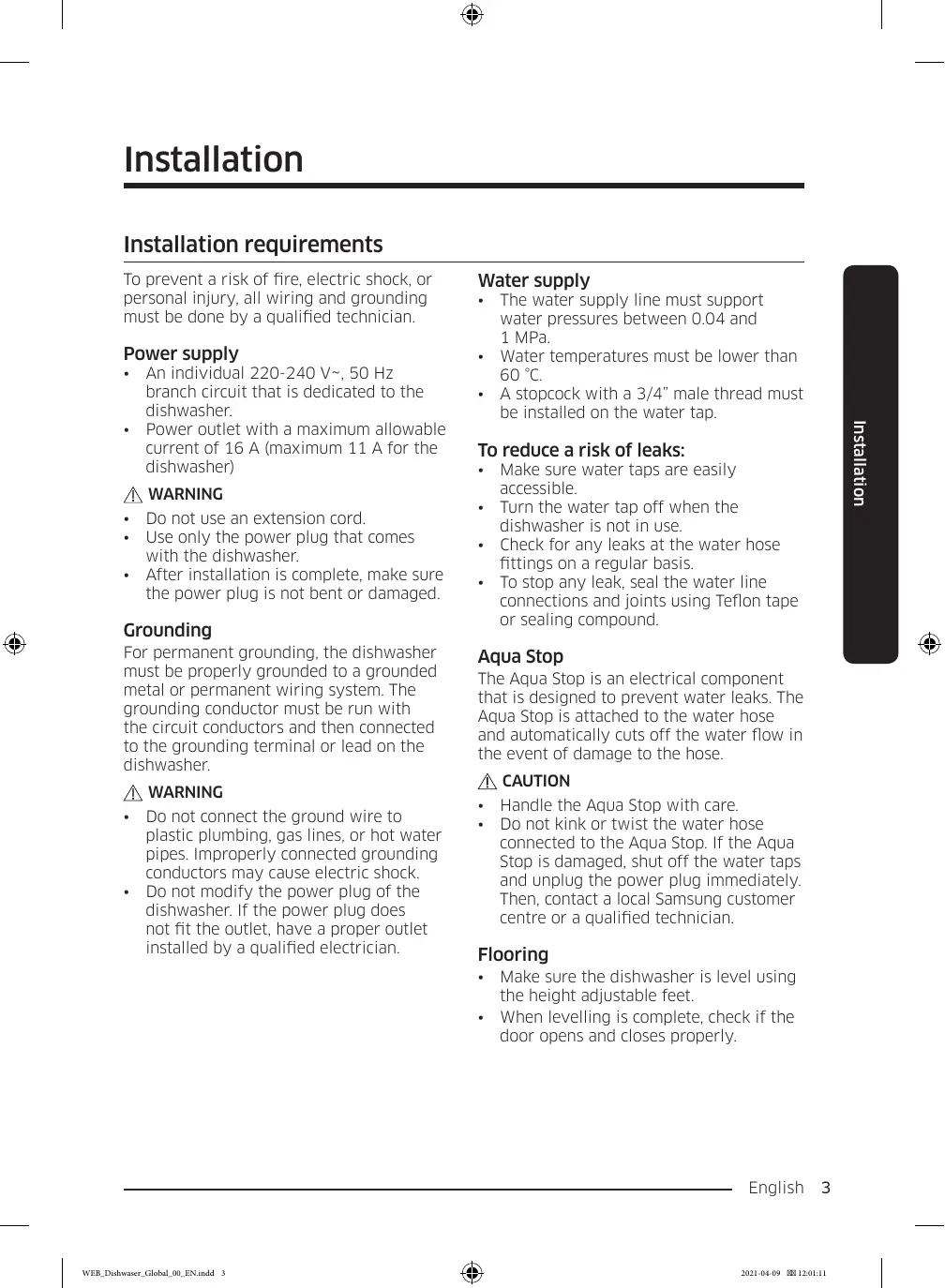 The water supply line must support water pressures between 0.04 and 1 MPa. Water temperatures must be lower than 60 °C. A stopcock with a 3/4” male thread must be installed on the water tap. Make sure water taps are easily accessible. Turn the water tap off when the dishwasher is not in use. Check for any leaks at the water hose fittings on a regular basis. To stop any leak, seal the water line connections and joints using Teflon tape or sealing compound.