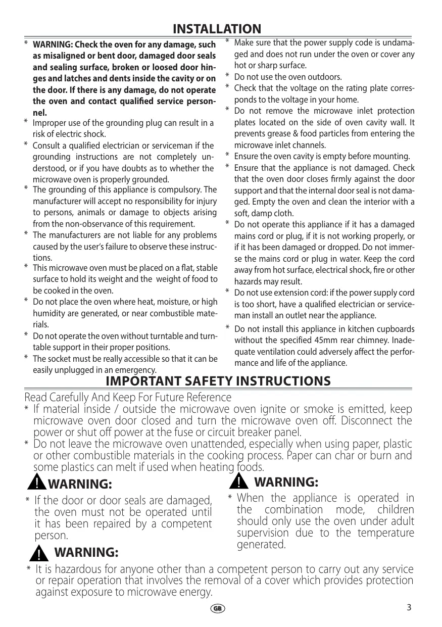 Do not use the oven outdoors. Check that the voltage on the rating plate corresponds to the voltage in your home. Do not remove the microwave inlet protection plates located on the side of oven cavity wall. It prevents grease & food particles from entering the microwave inlet channels. Ensure the oven cavity is empty before mounting. Ensure that the appliance is not damaged. Check that the oven door closes firmly against the door support and that the internal door seal is not damaged. Empty the oven and clean the interior with a soft, damp cloth. Do not operate this appliance if it has a damaged mains cord or plug, if it is not working properly, or if it has been damaged or dropped. Do not immerse the mains cord or plug in water. Keep the cord away from hot surface, electrical shock, fire or other hazards may result. Do not use extension cord: if the power supply cord is too short, have a qualified electrician or serviceman install an outlet near the appliance. Do not install this appliance in kitchen cupboards without the specified 45mm rear chimney. Inadequate ventilation could adversely affect the performance and life of the appliance.