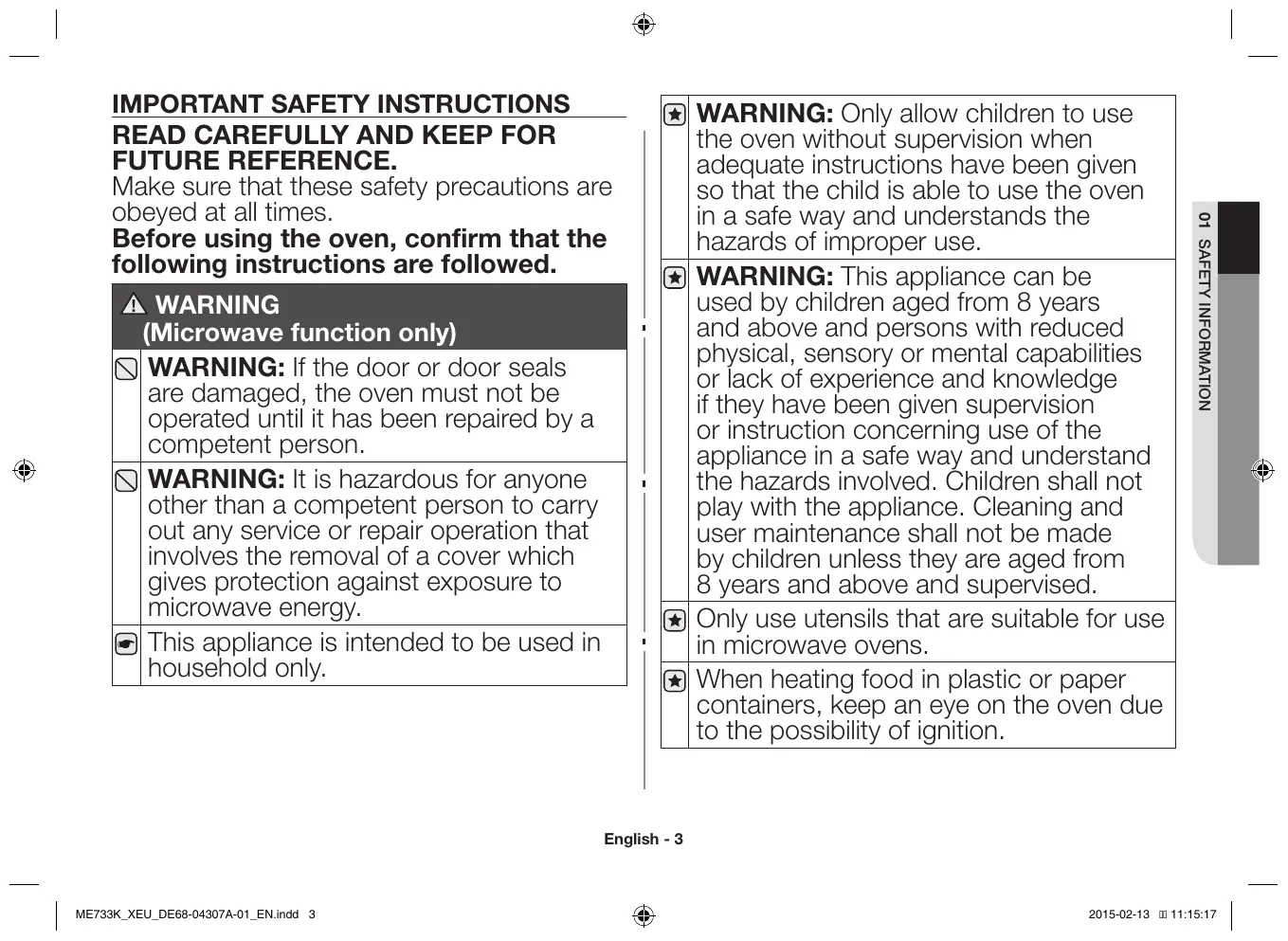 FUTURE REFERENCE. Make sure that these safety precautions are obeyed at all times. Before using the oven, confirm that the following instructions are followed. English - 3 ME733K_XEU_DE68-04307A-01_EN.indd 3 2015-02-13 11:15:17 The microwave oven is intended for heating food and beverages. Drying of food or clothing and heating of warming pads, slippers, sponges, damp cloth and similar may lead to risk of injury, ignition or fire. If smoke is emitted, switch off or unplug the appliance and keep the door closed in order to stifle any flames.