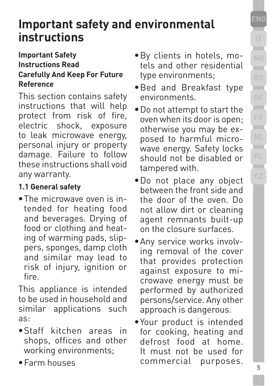 ••The microwave oven is intended for heating food and beverages. Drying of food or clothing and heating of warming pads, slippers, sponges, damp cloth and similar may lead to risk of injury, ignition or fire. This appliance is intended to be used in household and similar applications such as: ••Staff kitchen areas in shops, offices and other working environments; ••Farm houses