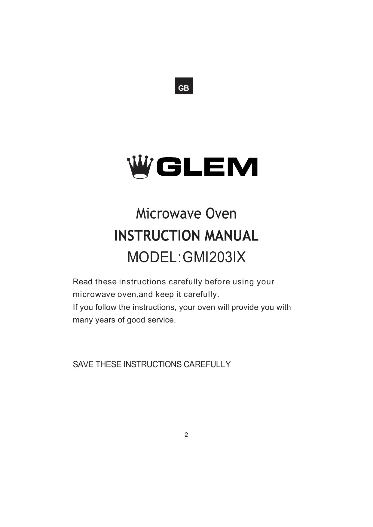 GB MODEL:GMI203IX Read these instructions carefully before using your microwave oven,and keep it carefully. If you follow the instructions, your oven will provide you with many years of good service.