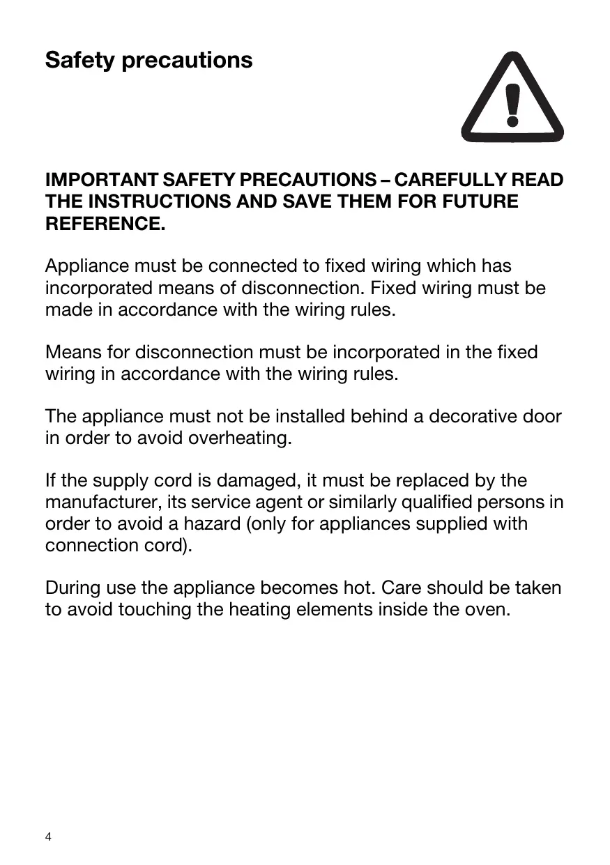 THE INSTRUCTIONS AND SAVE THEM FOR FUTURE REFERENCE. Appliance must be connected to fixed wiring which has incorporated means of disconnection. Fixed wiring must be made in accordance with the wiring rules. Means for disconnection must be incorporated in the fixed wiring in accordance with the wiring rules. The appliance must not be installed behind a decorative door in order to avoid overheating. If the supply cord is damaged, it must be replaced by the manufacturer, its service agent or similarly qualified persons in order to avoid a hazard (only for appliances supplied with connection cord). During use the appliance becomes hot. Care should be taken to avoid touching the heating elements inside the oven.