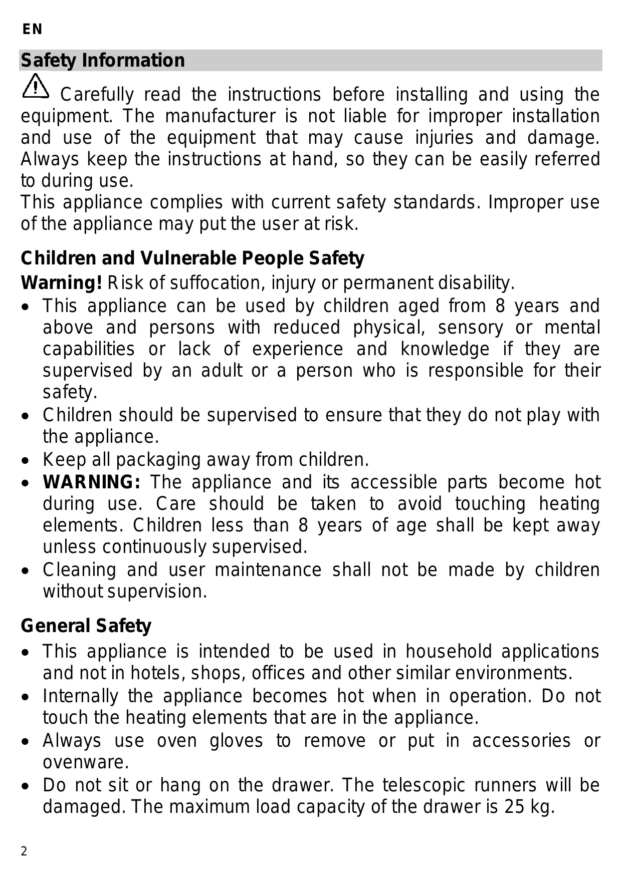 EN Safety Information Carefully read the instructions before installing and using the equipment. The manufacturer is not liable for improper installation and use of the equipment that may cause injuries and damage. Always keep the instructions at hand, so they can be easily referred to during use. This appliance complies with current safety standards. Improper use of the appliance may put the user at risk. Children and Vulnerable People Safety Warning! Risk of suffocation, injury or permanent disability. • This appliance can be used by children aged from 8 years and above and persons with reduced physical, sensory or mental capabilities or lack of experience and knowledge if they are supervised by an adult or a person who is responsible for their safety. • Children should be supervised to ensure that they do not play with the appliance. • Keep all packaging away from children. • WARNING: The appliance and its accessible parts become hot during use. Care should be taken to avoid touching heating elements. Children less than 8 years of age shall be kept away unless continuously supervised. • Cleaning and user maintenance shall not be made by children without supervision. General Safety • This appliance is intended to be used in household applications and not in hotels, shops, offices and other similar environments. • Internally the appliance becomes hot when in operation. Do not touch the heating elements that are in the appliance. • Always use oven gloves to remove or put in accessories or ovenware. • Do not sit or hang on the drawer. The telescopic runners will be damaged. The maximum load capacity of the drawer is 25 kg. 2
