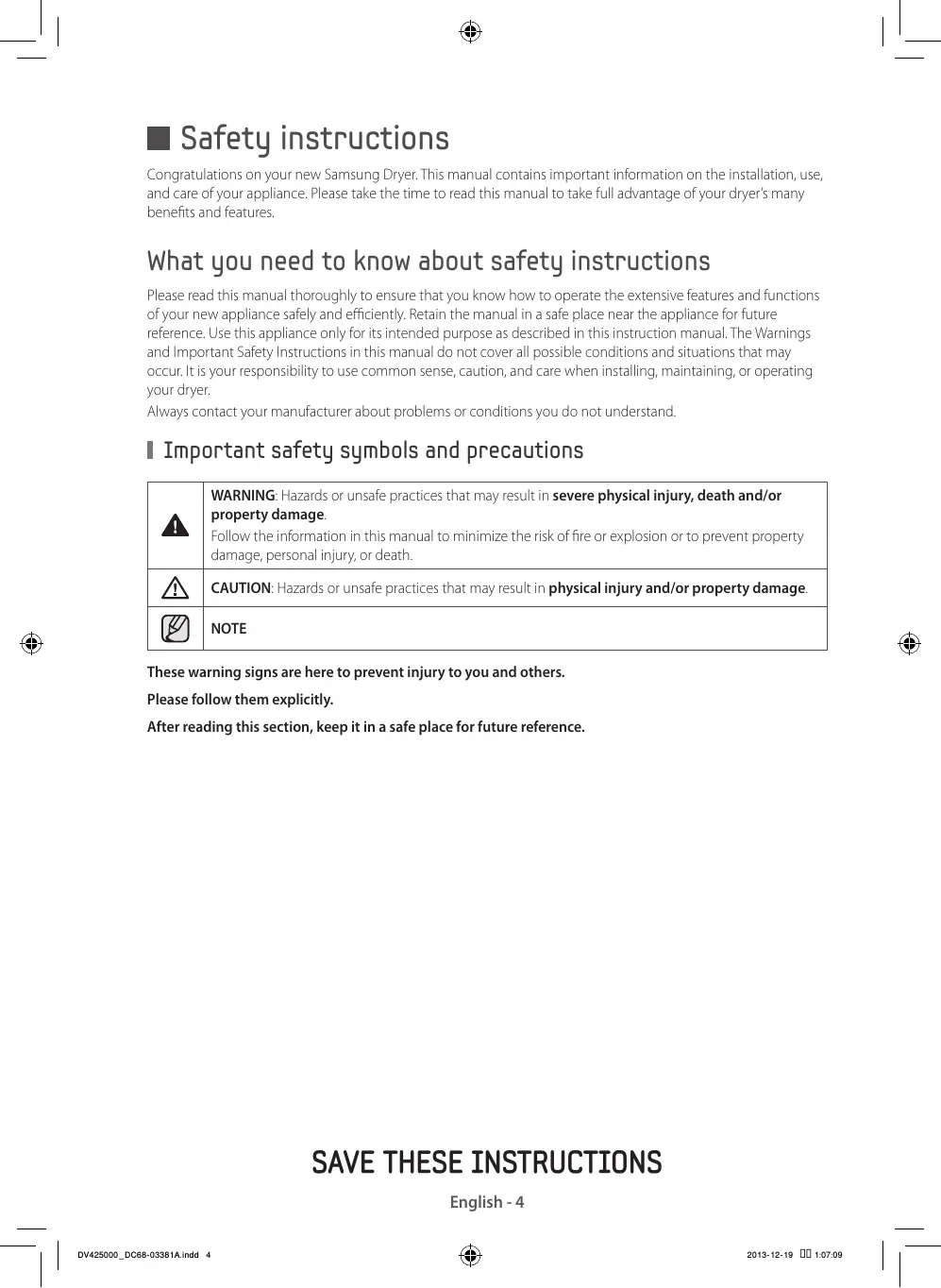 English - 5 DV425000_DC68-03381A.indd 5 2013-12-19 1:07:10 Important safety instructions WARNING To reduce the risk of fire, electric shock, or injury to persons when using your appliance, follow basic precautions, including the following: