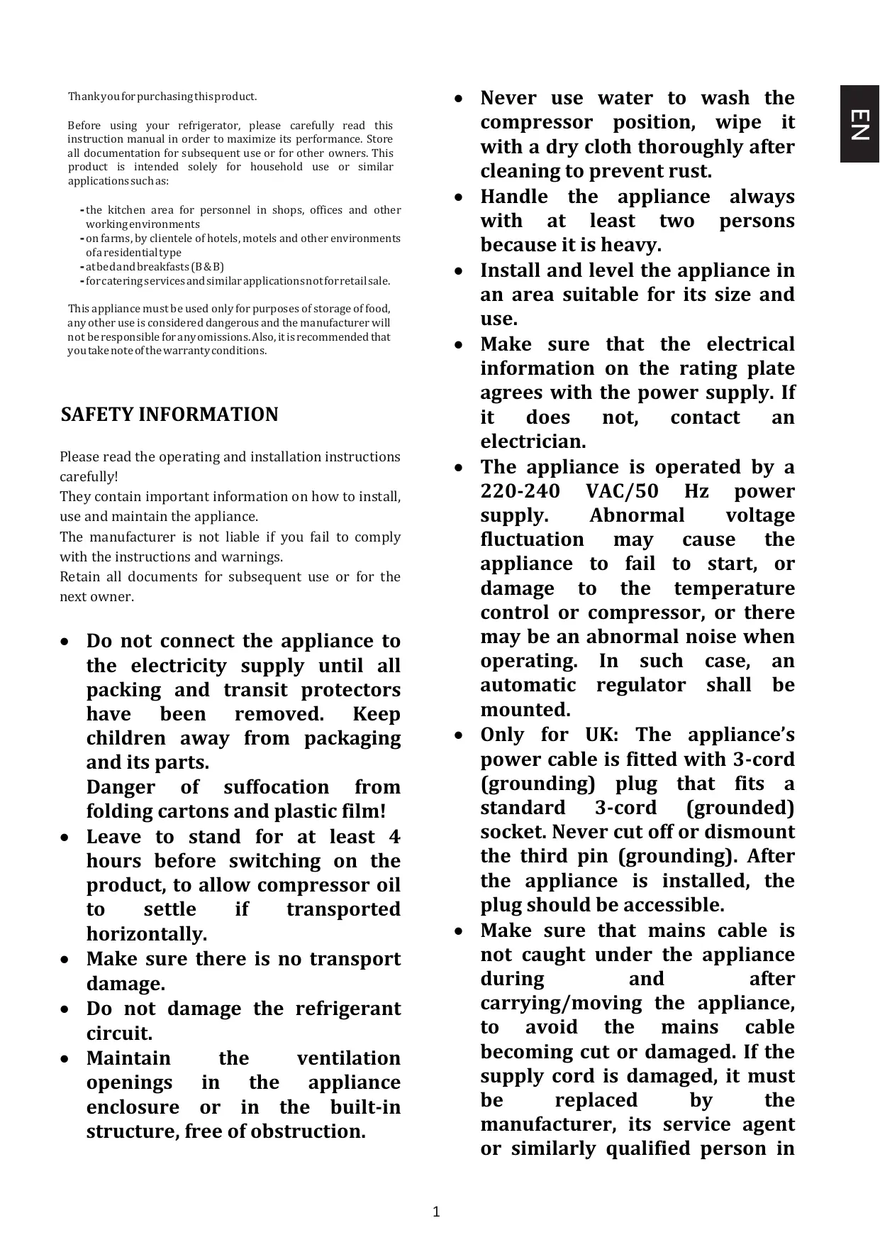 Handle the appliance always with at least two persons because it is heavy. Install and level the appliance in an area suitable for its size and use. Make sure that the electrical information on the rating plate agrees with the power supply. If it does not, contact an electrician. The appliance is operated by a 220-240 VAC/50 Hz power supply. Abnormal voltage fluctuation may cause the appliance to fail to start, or damage to the temperature control or compressor, or there may be an abnormal noise when operating. In such case, an automatic regulator shall be mounted. Only for UK: The appliance’s power cable is fitted with 3-cord (grounding) plug that fits a standard 3-cord (grounded) socket. Never cut off or dismount the third pin (grounding). After the appliance is installed, the plug should be accessible. Make sure that mains cable is not caught under the appliance during and after carrying/moving the appliance, to avoid the mains cable becoming cut or damaged. If the supply cord is damaged, it must be replaced by the manufacturer, its service agent or similarly qualified person in