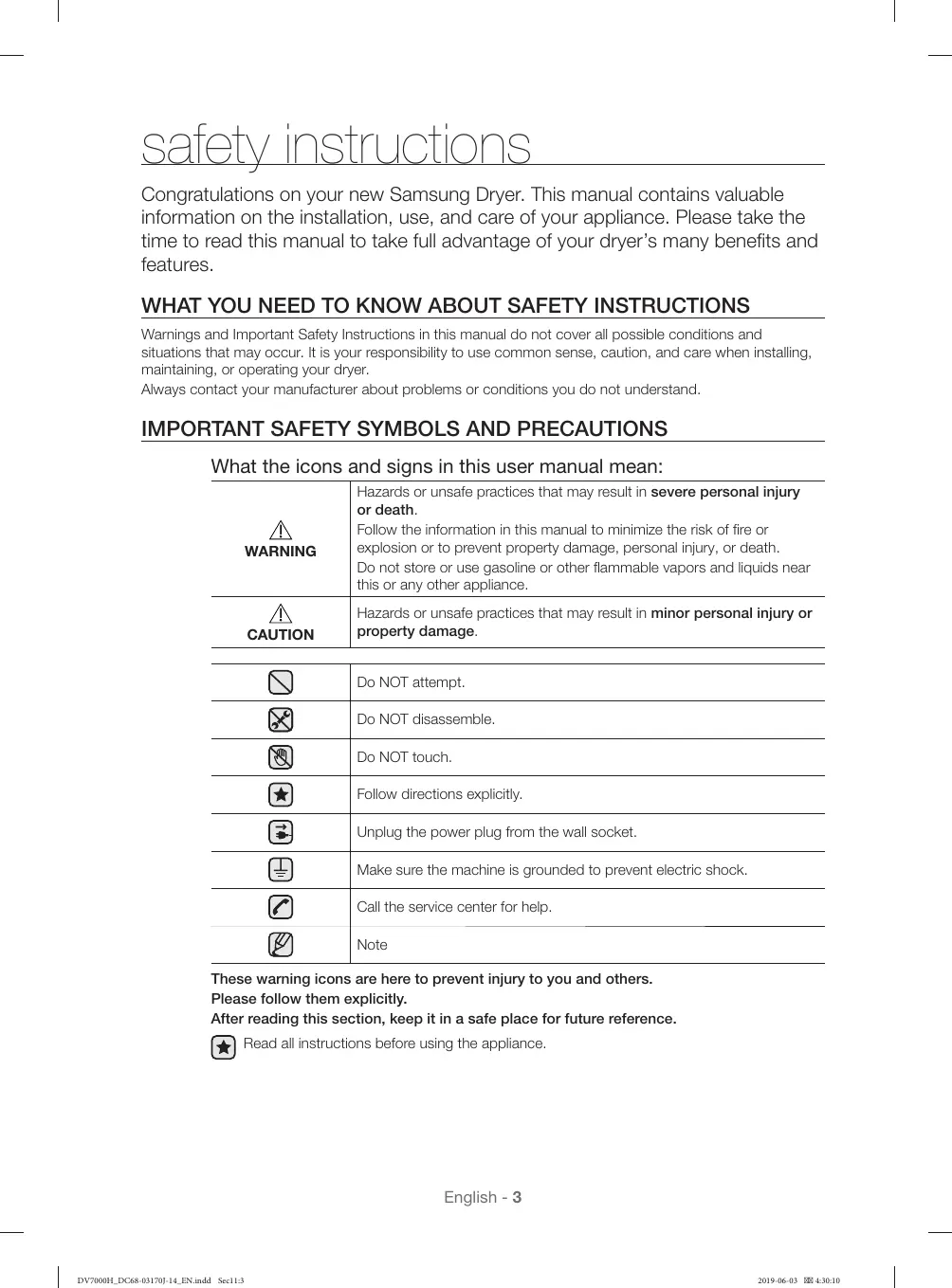 What the icons and signs in this user manual mean: WARNING CAUTION Hazards or unsafe practices that may result in severe personal injury or death. Follow the information in this manual to minimize the risk of fire or explosion or to prevent property damage, personal injury, or death. Do not store or use gasoline or other flammable vapors and liquids near this or any other appliance. Hazards or unsafe practices that may result in minor personal injury or property damage. Do NOT attempt. Do NOT disassemble. Do NOT touch. Follow directions explicitly. Unplug the power plug from the wall socket. Make sure the machine is grounded to prevent electric shock. Call the service center for help. Note These warning icons are here to prevent injury to you and others. Please follow them explicitly. After reading this section, keep it in a safe place for future reference. Read all instructions before using the appliance. English - 3 DV7000H_DC68-03170J-14_EN.indd Sec11:3 2019-06-03 4:30:10 safety instructions WARNING
