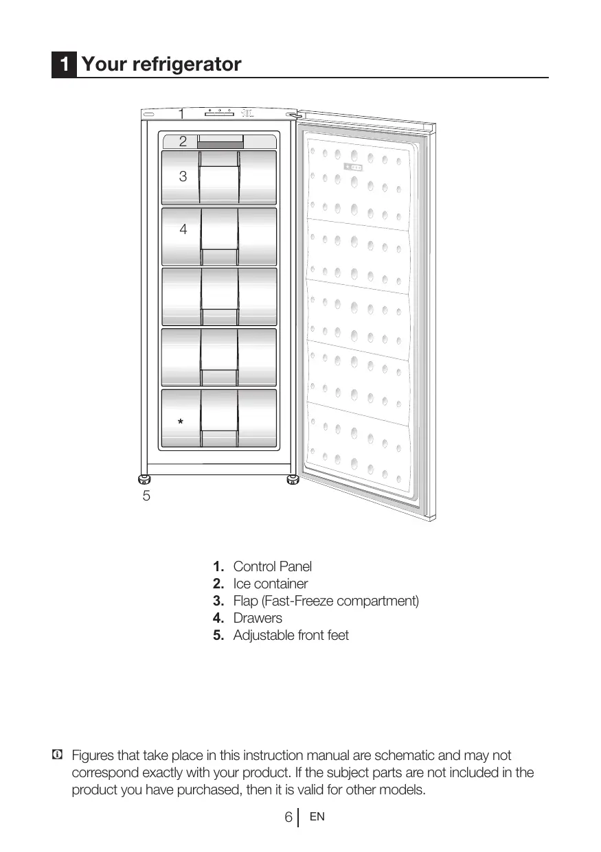 Control Panel Ice container Flap (Fast-Freeze compartment) Drawers Adjustable front feet