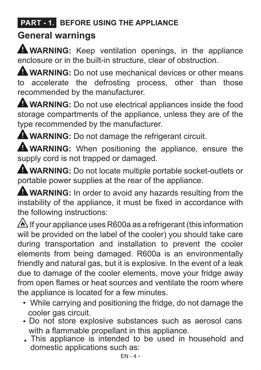 - This appliance is produced to be used in houses and it is only suitable for cooling / storing foods. It is not suitable for commercial or common use and/or for storing substances except for food. Our company is not responsible for any losses incurred by inappropriate usage of the appliance.