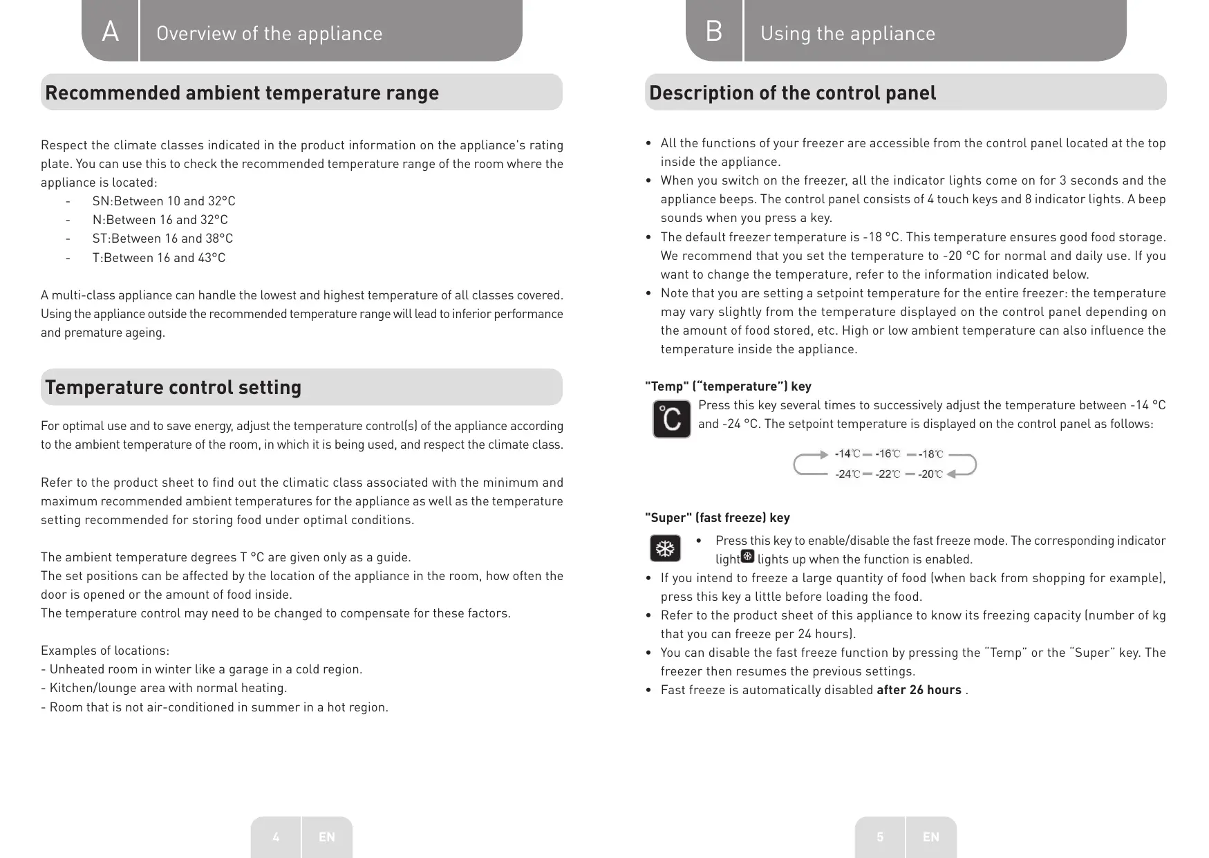Overview of the appliance Recommended ambient temperature range Respect the climate classes indicated in the product information on the appliance's rating plate. You can use this to check the recommended temperature range of the room where the appliance is located: SN:Between 10 and 32°C N:Between 16 and 32°C ST:Between 16 and 38°C T:Between 16 and 43°C A multi-class appliance can handle the lowest and highest temperature of all classes covered. Using the appliance outside the recommended temperature range will lead to inferior performance and premature ageing. Temperature control setting For optimal use and to save energy, adjust the temperature control(s) of the appliance according to the ambient temperature of the room, in which it is being used, and respect the climate class. Refer to the product sheet to find out the climatic class associated with the minimum and maximum recommended ambient temperatures for the appliance as well as the temperature setting recommended for storing food under optimal conditions. Using the appliance Description of the control panel