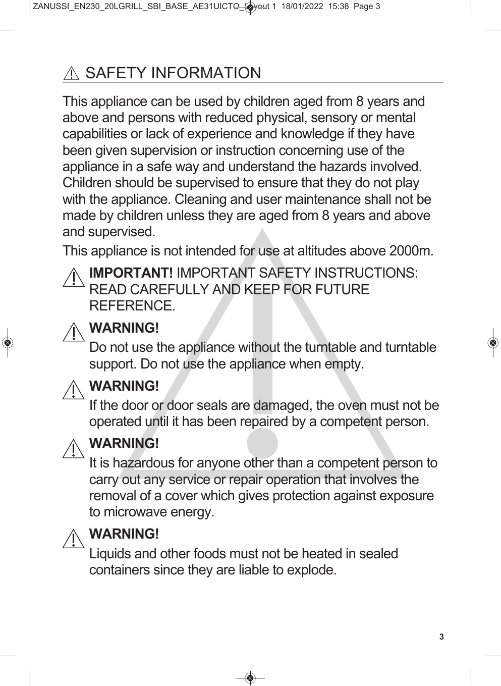 - ENVIRONMENT CONCERNS ZANUSSI_EN230_20LGRILL_SBI_BASE_AE31UICTO_Layout 1 18/01/2022 15:38 Page 3 SAFETY INFORMATION This appliance can be used by children aged from 8 years and above and persons with reduced physical, sensory or mental capabilities or lack of experience and knowledge if they have been given supervision or instruction concerning use of the appliance in a safe way and understand the hazards involved. Children should be supervised to ensure that they do not play with the appliance. Cleaning and user maintenance shall not be made by children unless they are aged from 8 years and above and supervised. This appliance is not intended for use at altitudes above 2000m. IMPORTANT! IMPORTANT SAFETY INSTRUCTIONS: p. 17
