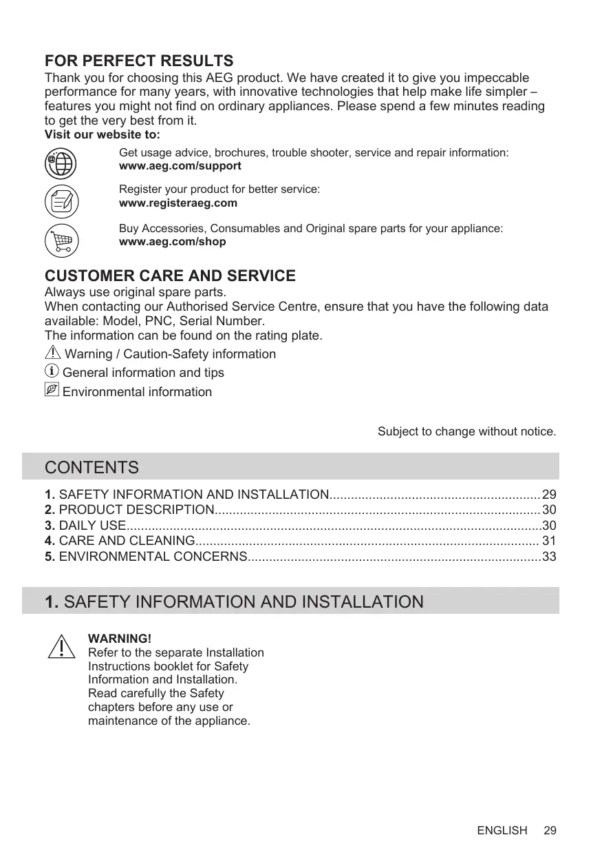 Thank you for choosing this AEG product. We have created it to give you impeccable performance for many years, with innovative technologies that help make life simpler – features you might not find on ordinary appliances. Please spend a few minutes reading to get the very best from it. Visit our website to: