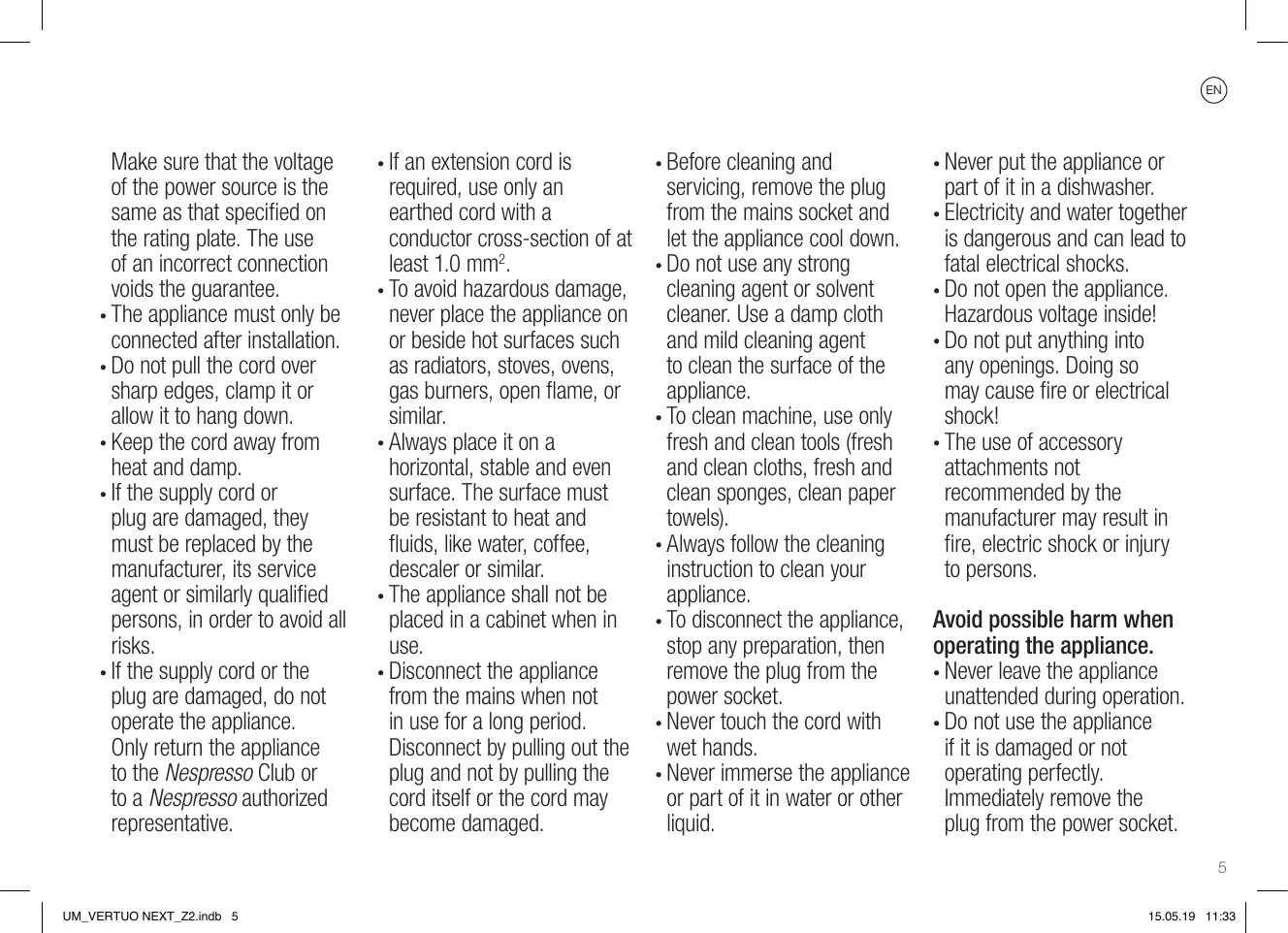 UM_VERTUO NEXT_Z2.indb 8 •• Ne touchez jamais le cordon d’alimentation avec les mains mouillées. •• Ne plongez jamais la machine, en tout ou partie, dans l’eau ou dans d’autres liquides. •• Ne placez jamais la machine ou certains de ses composants au lavevaisselle. •• La présence simultanée d’électricité et d’eau est dangereuse et peut provoquer des décharges électriques mortelles.