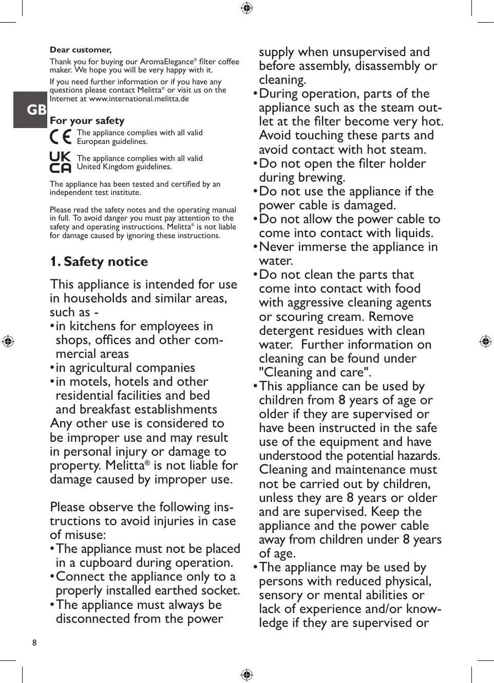 • During operation, parts of the appliance such as the steam out GB For your safety let at the filter become very hot. The appliance complies with all valid Avoid touching these parts and European guidelines. avoid contact with hot steam. The appliance complies with all valid • Do not open the filter holder United Kingdom guidelines. during brewing. The appliance has been tested and certified by an independent test institute. • Do not use the appliance if the power cable is damaged. Please read the safety notes and the operating manual in full. To avoid danger you must pay attention to the • Do not allow the power cable to safety and operating instructions. Melitta is not liable come into contact with liquids. for damage caused by ignoring these instructions. • Never immerse the appliance in water. 1. Safety notice • Do not clean the parts that This appliance is intended for use come into contact with food in households and similar areas, with aggressive cleaning agents such as or scouring cream. Remove • in kitchens for employees in detergent residues with clean shops, offices and other comwater. Further information on mercial areas cleaning can be found under • in agricultural companies "Cleaning and care". • in motels, hotels and other • This appliance can be used by residential facilities and bed children from 8 years of age or and breakfast establishments older if they are supervised or Any other use is considered to have been instructed in the safe be improper use and may result use of the equipment and have in personal injury or damage to understood the potential hazards. property. Melitta® is not liable for Cleaning and maintenance must damage caused by improper use. not be carried out by children, unless they are 8 years or older Please observe the following insand are supervised. Keep the tructions to avoid injuries in case appliance and the power cable of misuse: away from children under 8 years • The appliance must not be placed of age. in a cupboard during operation. • The appliance may be used by • Connect the appliance only to a persons with reduced physical, properly installed earthed socket. sensory or mental abilities or • The appliance must always be lack of experience and/or knowdisconnected from the power ledge if they are supervised or Dear customer, Thank you for buying our AromaElegance® filter coffee maker. We hope you will be very happy with it. If you need further information or if you have any questions please contact Melitta® or visit us on the Internet at www.international.melitta.de