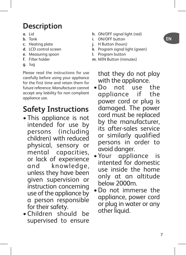 Please read the instructions for use carefully before using your appliance for the first time and retain them for future reference: Manufacturer cannot accept any liability for non compliant appliance use.