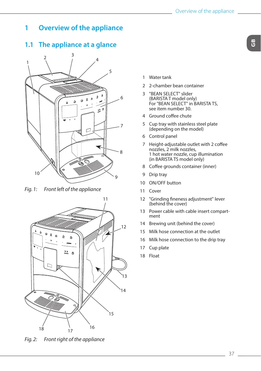 Fig. 1: 3 "BEAN SELECT" slider (BARISTA T model only) For "BEAN SELECT" in BARISTA TS, see item number 30. 4 Ground coffee chute 5 Cup tray with stainless steel plate (depending on the model) 6 Control panel 7 Height-adjustable outlet with 2 coffee nozzles, 2 milk nozzles, 1 hot water nozzle, cup illumination (in BARISTA TS model only) 8 Coffee grounds container (inner) 9 Drip tray