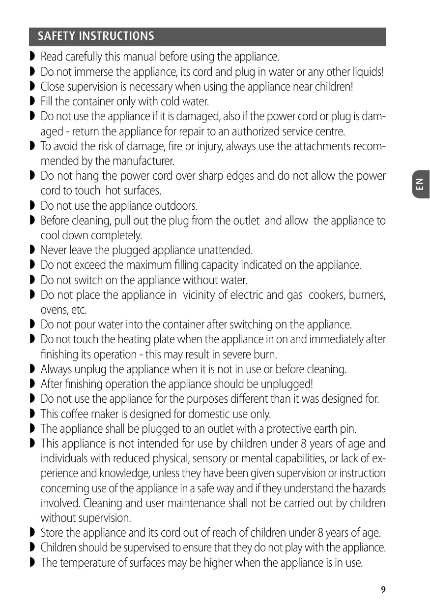 9. When all water has been used from the tank to brew coffee, the coffee maker will stop automatically and hold the coffee jug hot at 75°C ±° 2°C on the heat plate for about 40 minutes. If you serve out all the coffee from the jug before the coffee maker stops warming after brewing, immediately power off the coffee maker.