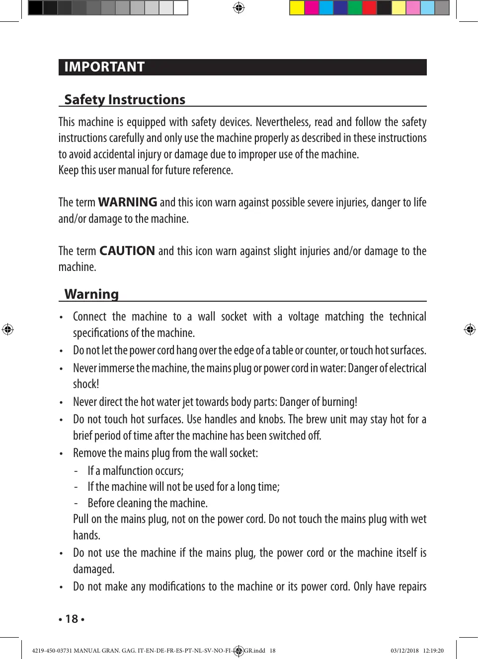 • Brancher la machine à une prise murale appropriée, dont la tension principale correspond aux données techniques de l'appareil. • Le câble d'alimentation ne doit pas pendre de la table ou du plan de travail et ne doit pas être en contact avec des surfaces chaudes. • Ne pas immerger la machine, la prise de courant ou le câble d'alimentation dans l'eau : danger de choc électrique ! • Ne jamais diriger le jet d’eau chaude vers des parties du corps : danger de brûlures ! • Ne pas toucher les surfaces chaudes. Utiliser les poignées et les boutons. Après l'arrêt de la machine, le groupe de distribution du café peut demeurer chaud pendant une courte période. • Débrancher la fiche de la prise murale : - en cas d'anomalies ; - si la machine reste inactive pendant une longue période ; - avant de procéder au nettoyage de la machine. • 42 • 4219-450-03731 MANUAL GRAN. GAG. IT-EN-DE-FR-ES-PT-NL-SV-NO-FI-DA-GR.indd 42
